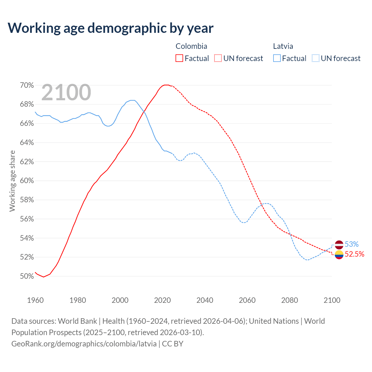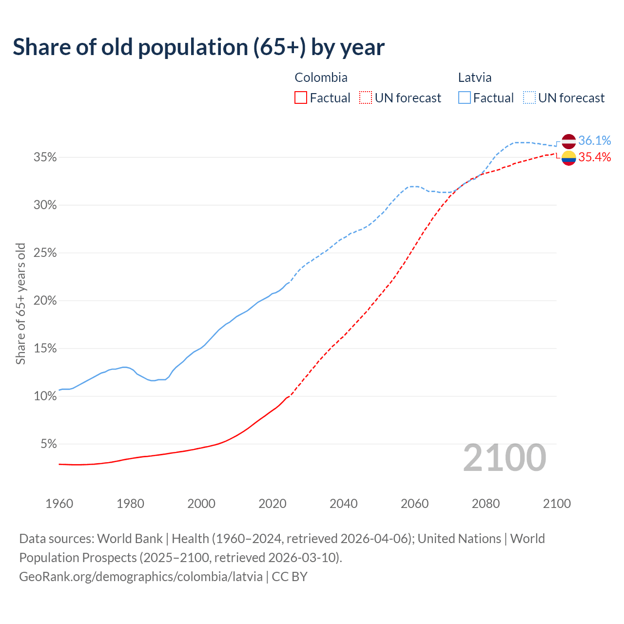 Median age Colombia vs Latvia, 1960-2100