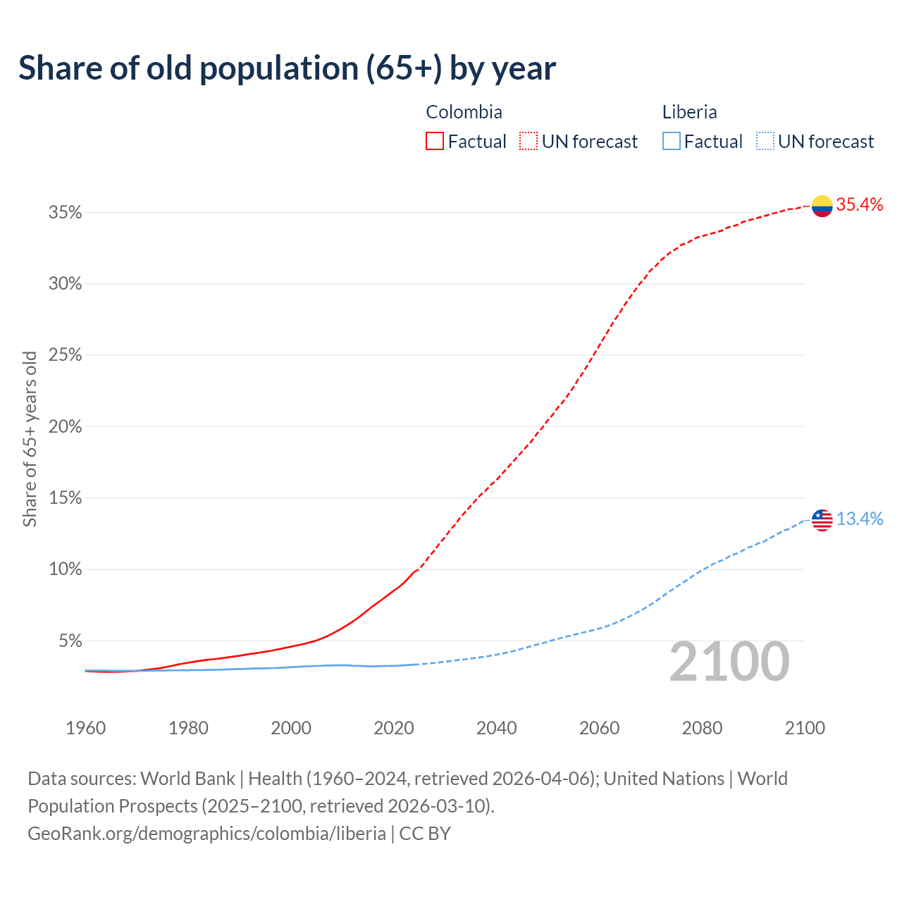 The share of older people aged 65 and over is 9.78% in Colombia and 3.3% in Liberia. Life expectancy in Colombia compared to Liberia .