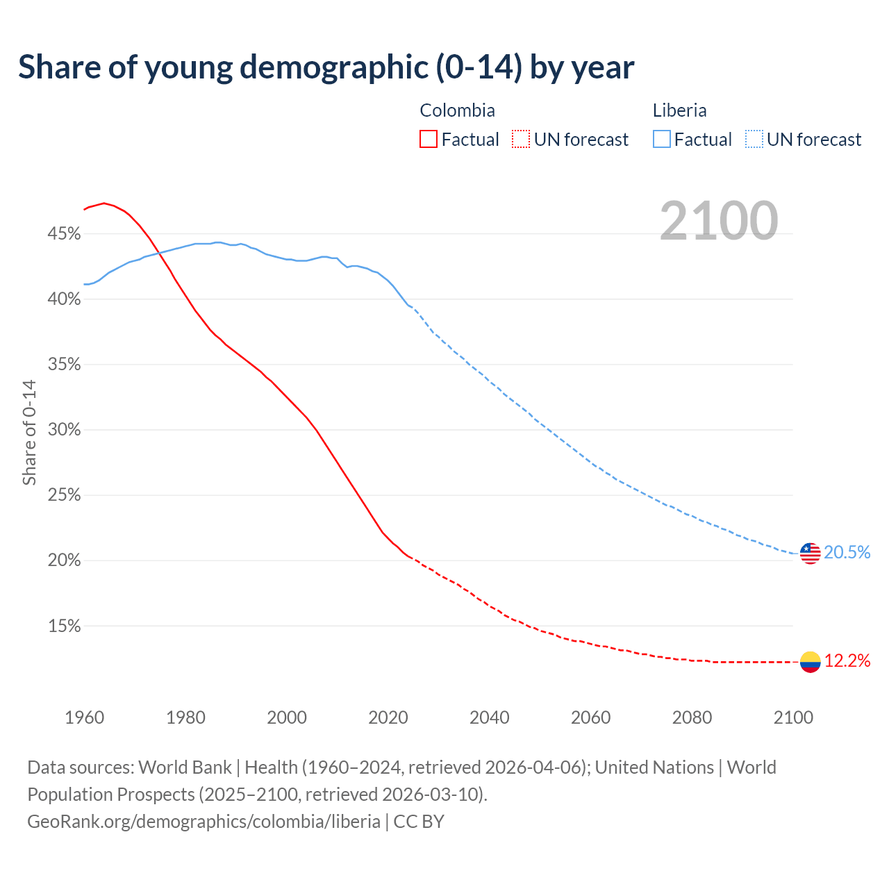 - The share of young demographic (0-15 years old) in Colombia is 20.3% vs 39.5% in Liberia.