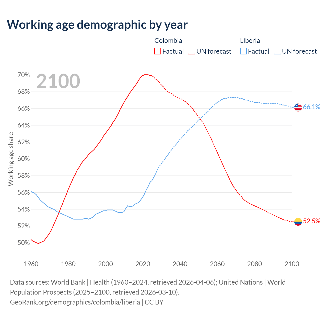 - Colombia has 37.8M working age adults (aged 15-64) vs 3.37M in Liberia.