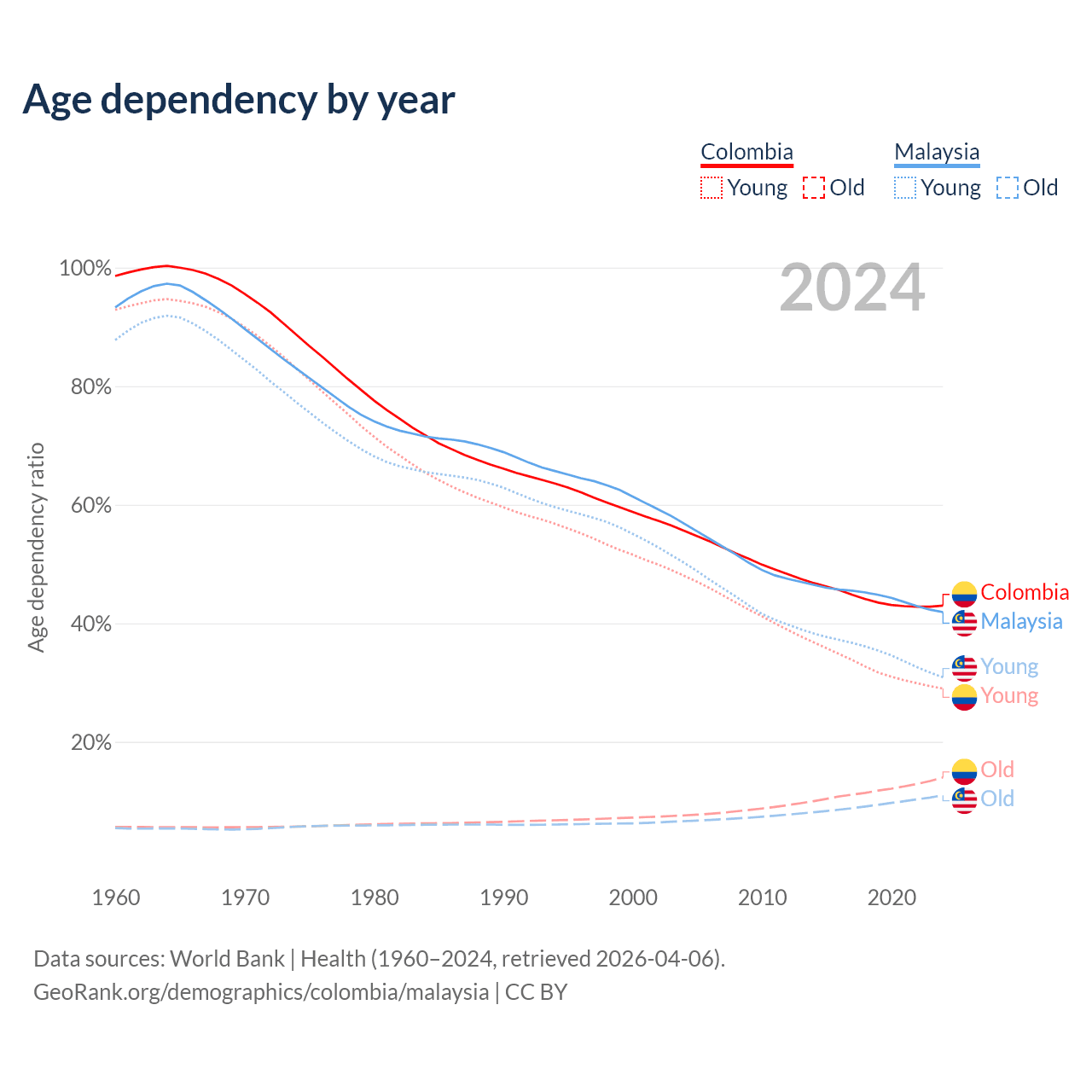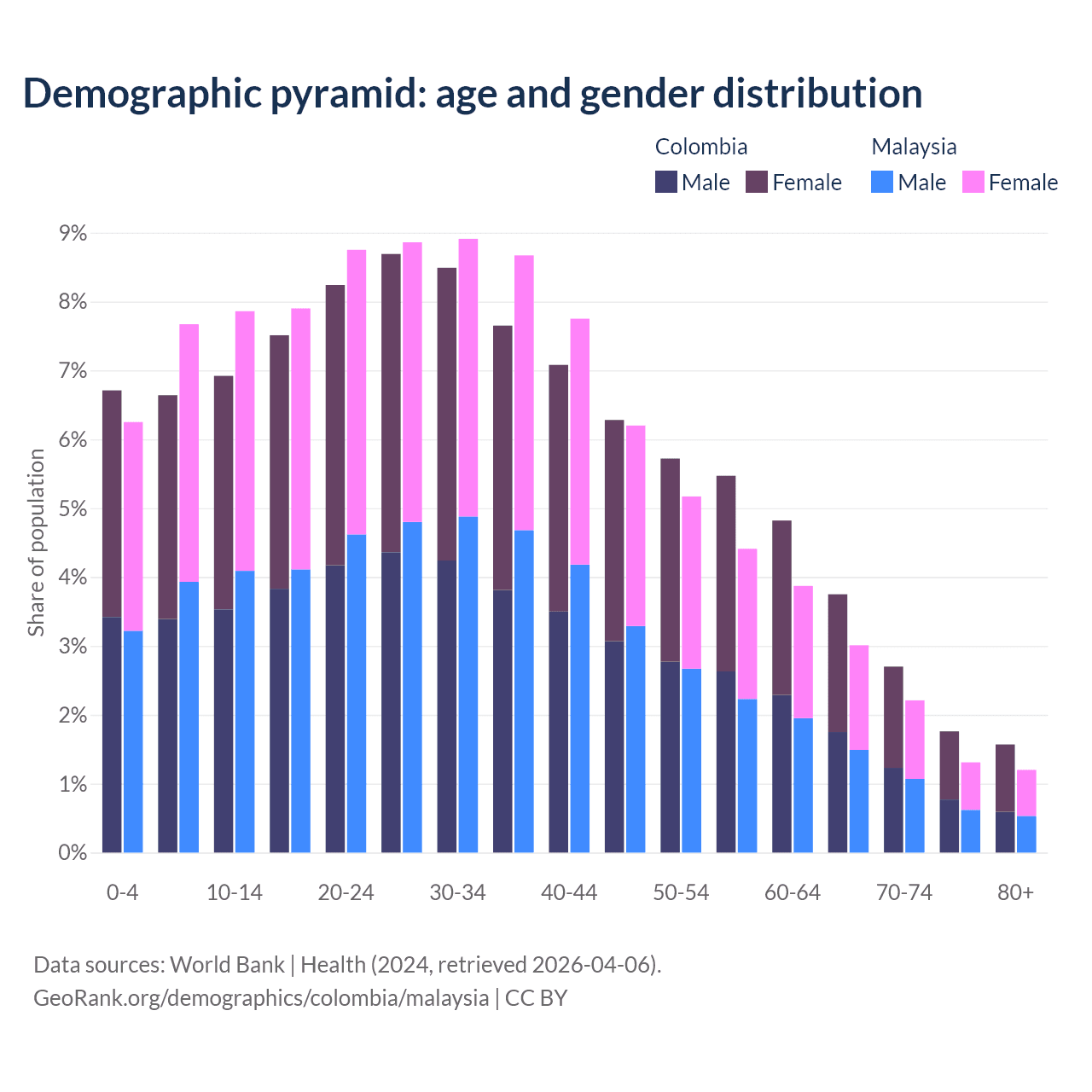 - Colombia is ranked 89/196 by median age (oldest to youngest) vs 92/196 for Malaysia.