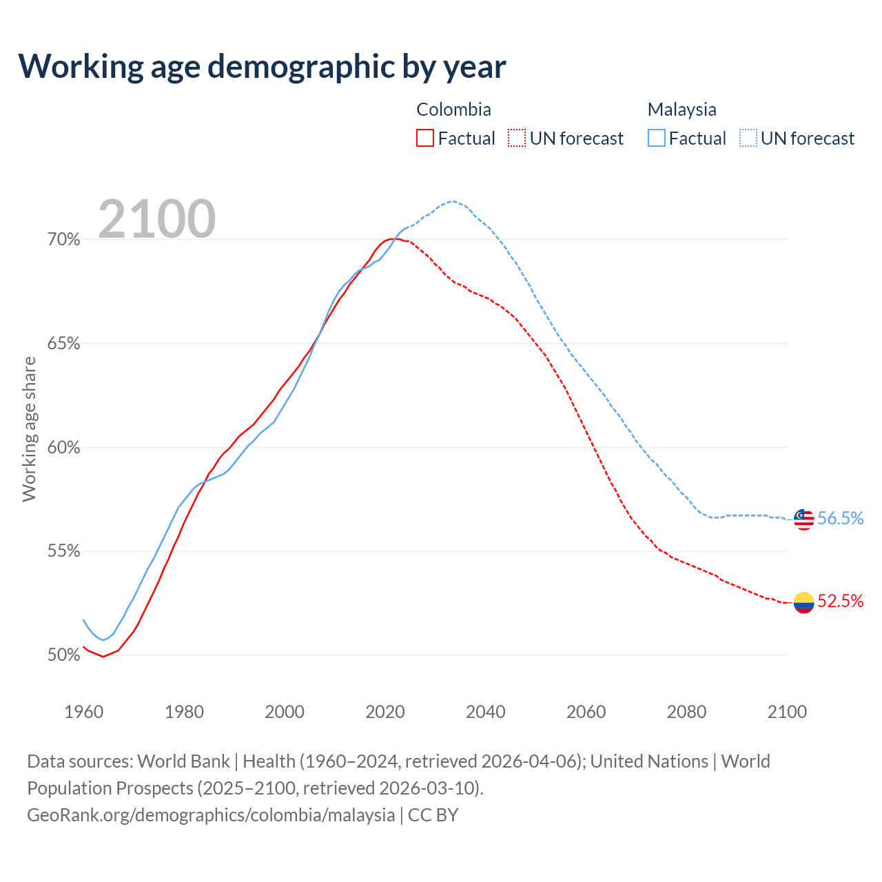 - Colombia has 37.8M working age adults (aged 15-64) vs 25.7M in Malaysia.