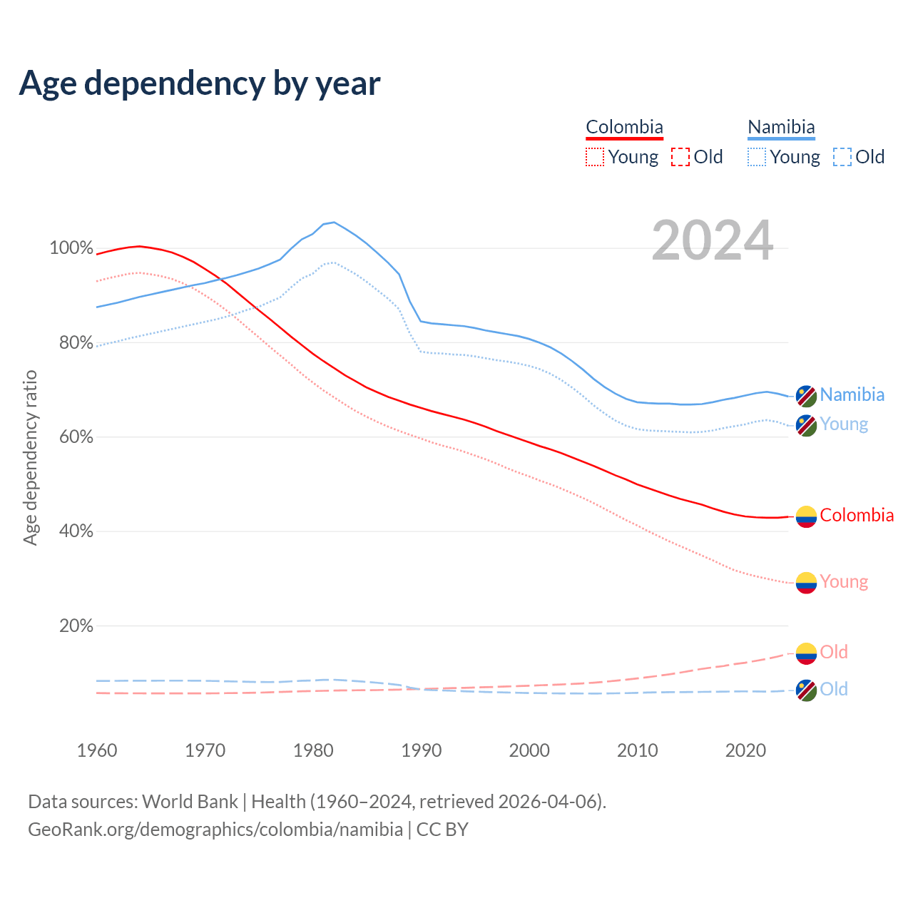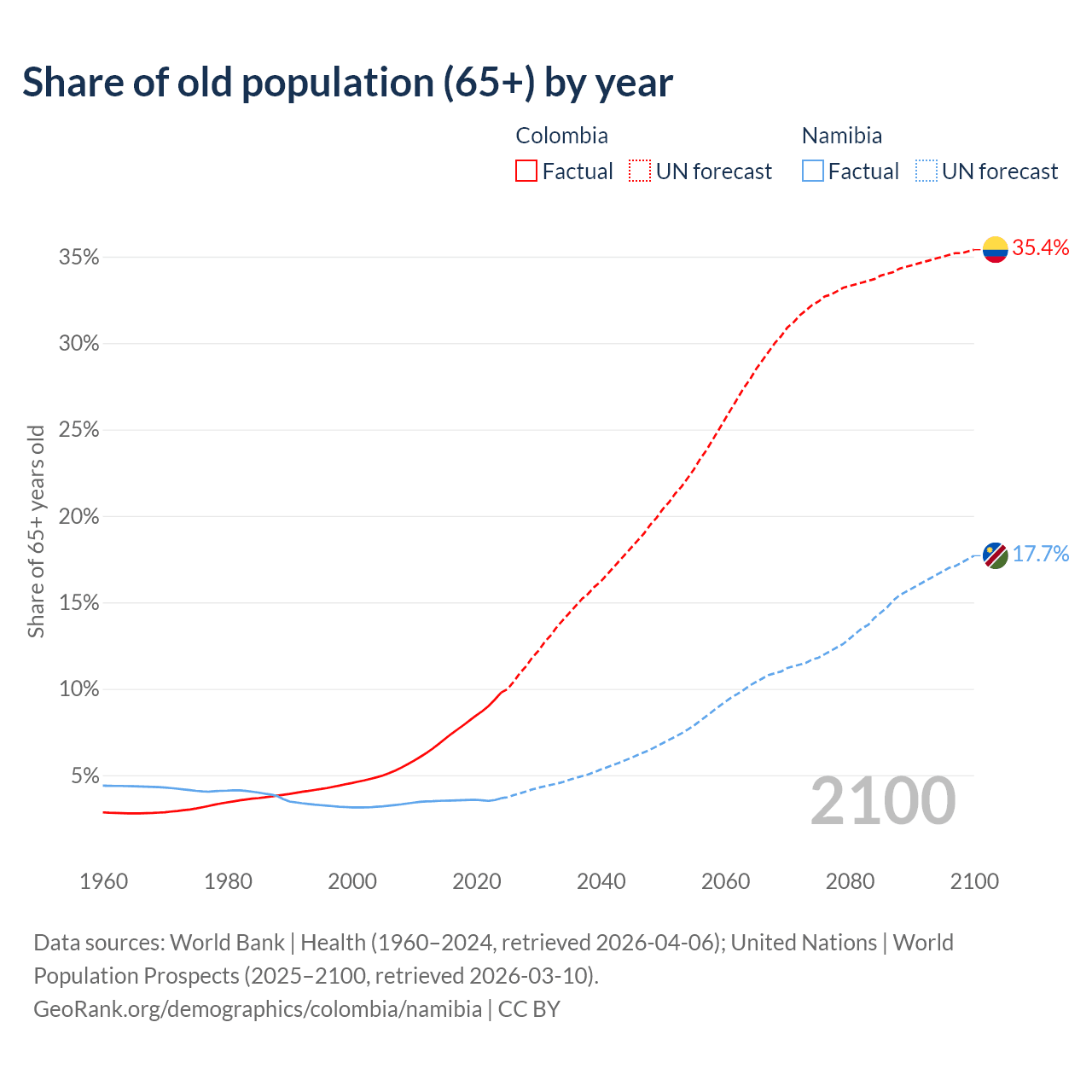 The share of older people aged 65 and over is 9.78% in Colombia and 3.67% in Namibia. Life expectancy in Colombia compared to Namibia .