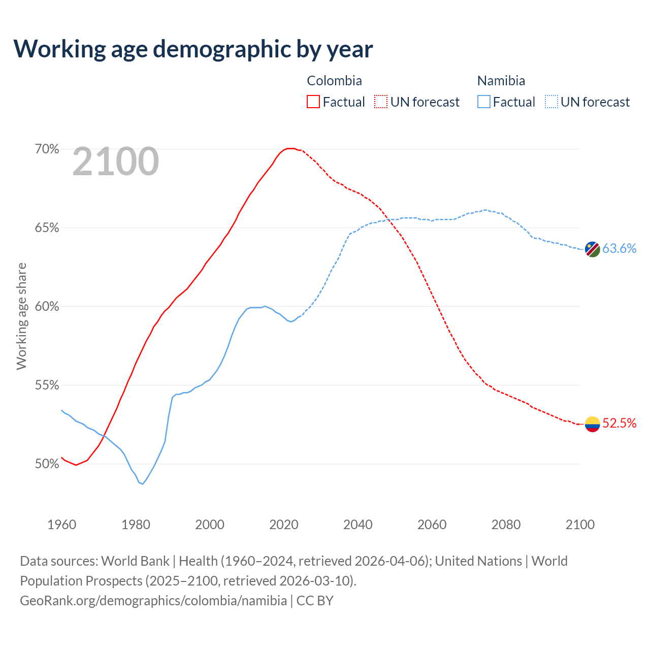 - Colombia has 37.8M working age adults (aged 15-64) vs 1.88M in Namibia.