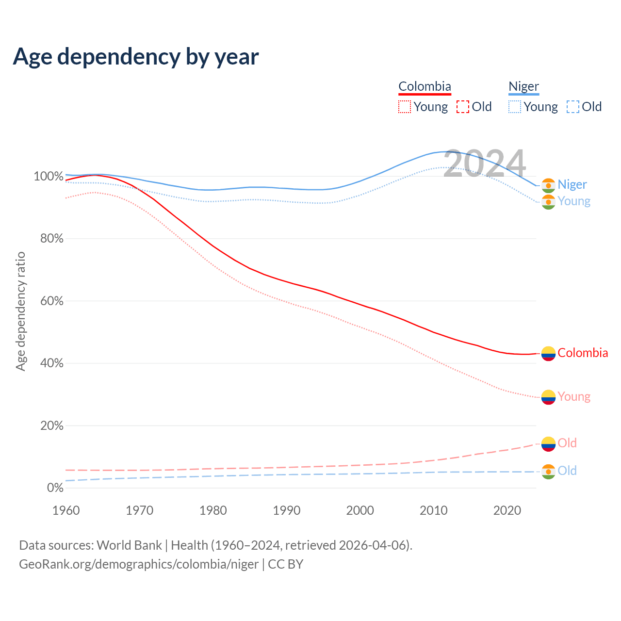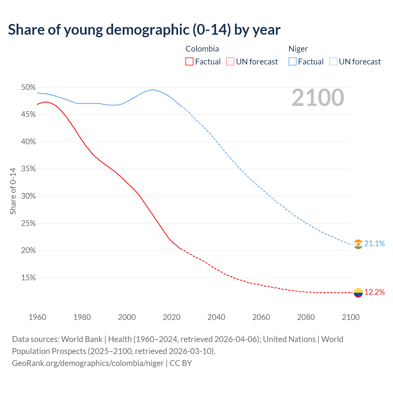 - The share of young demographic (0-15 years old) in Colombia is 20.3% vs 46.6% in Niger.
