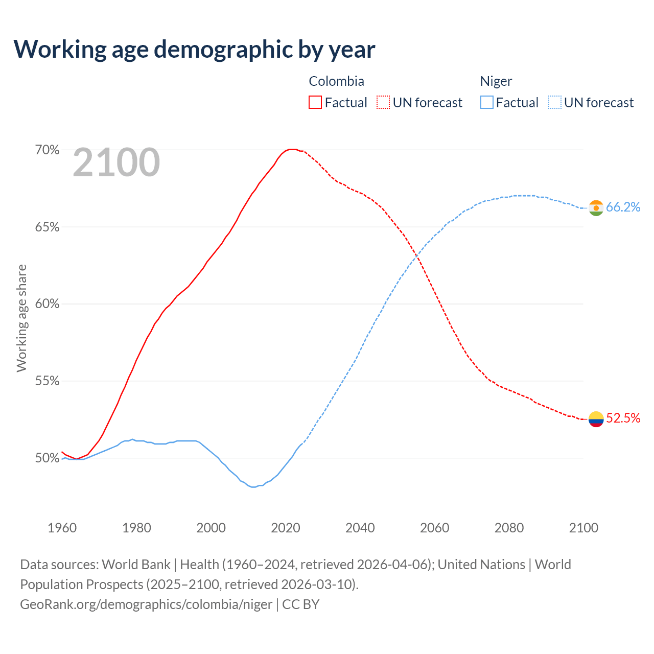 - Colombia has 37.8M working age adults (aged 15-64) vs 14.8M in Niger.