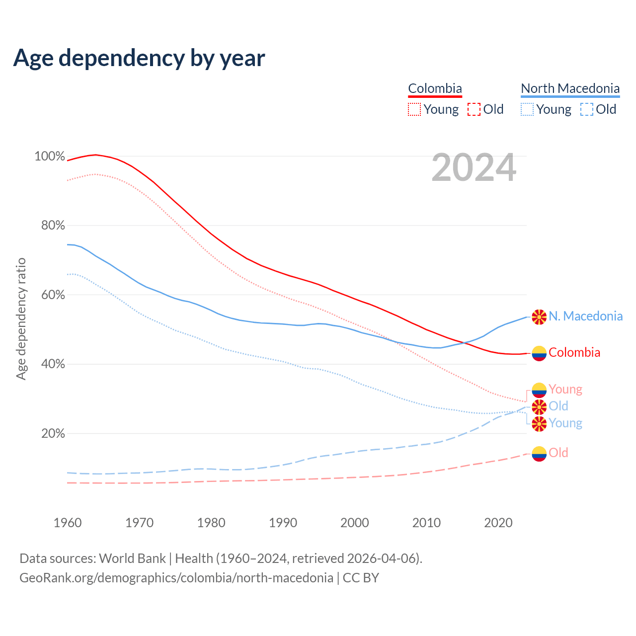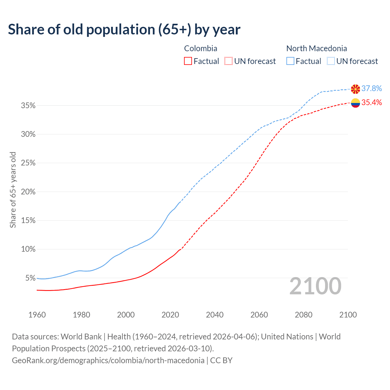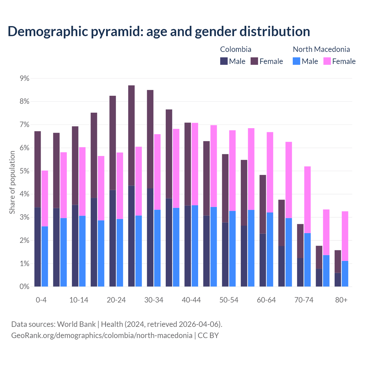 The share of older people aged 65 and over is 9.78% in Colombia and 18% in North Macedonia. Life expectancy in Colombia compared to North Macedonia .