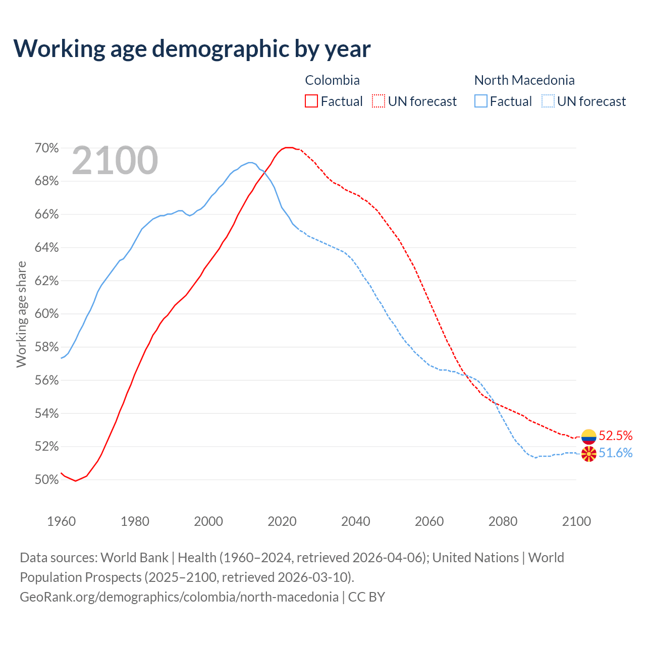 - The share of young demographic (0-15 years old) in Colombia is 20.3% vs 16.8% in North Macedonia.