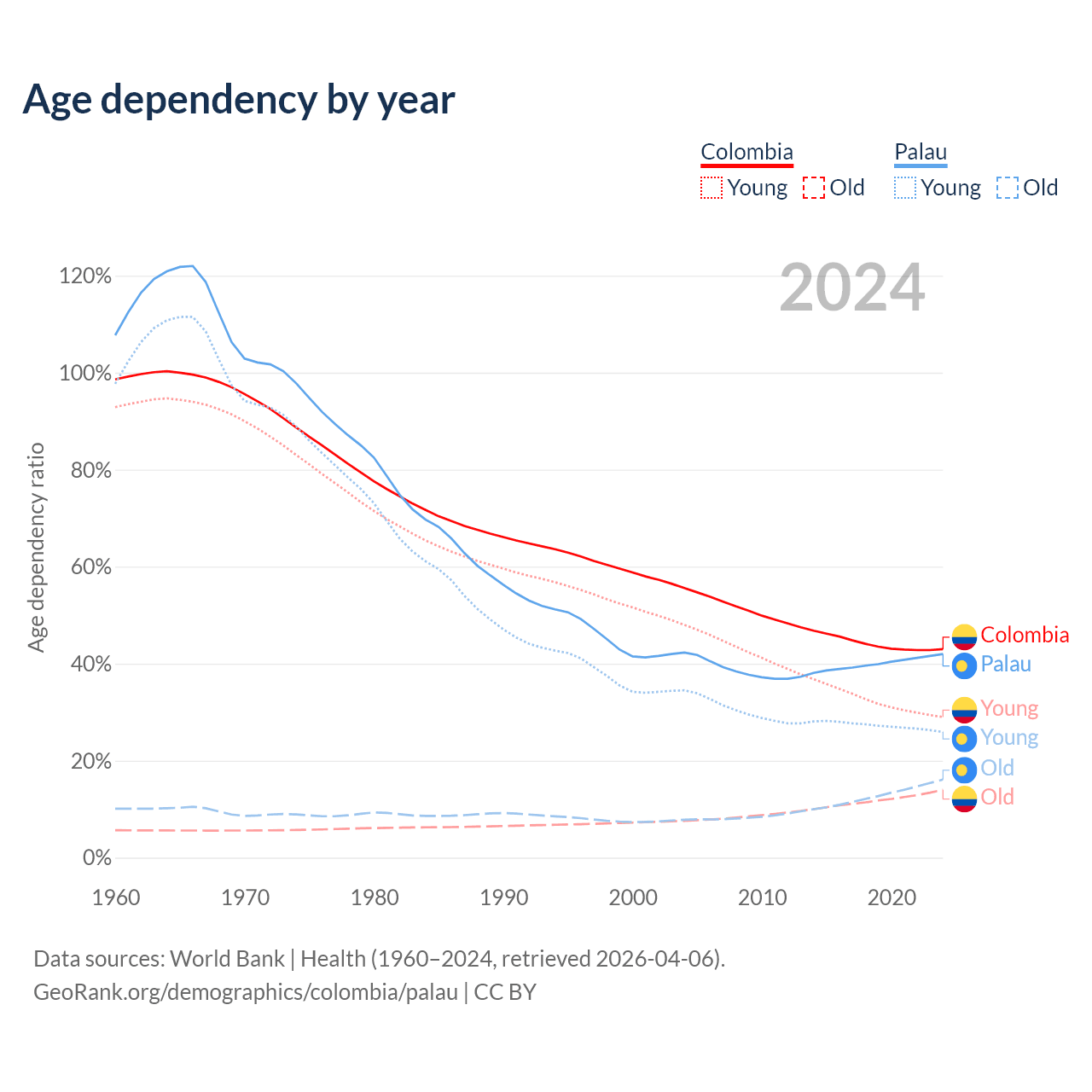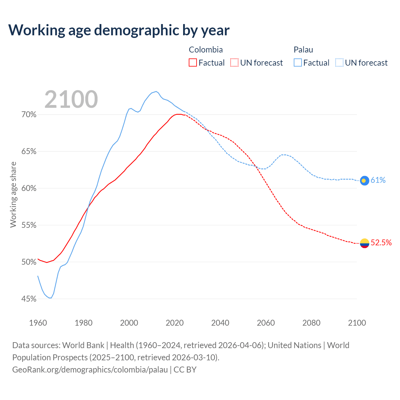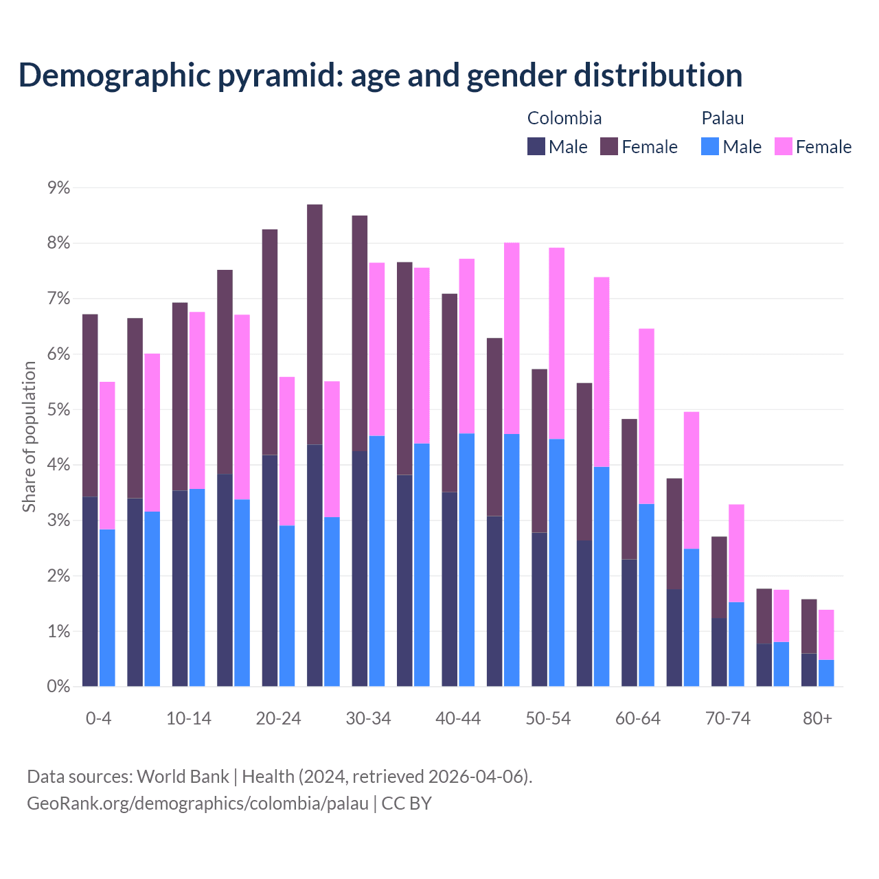 - The share of young demographic (0-15 years old) in Colombia is 20.3% vs 18.2% in Palau.