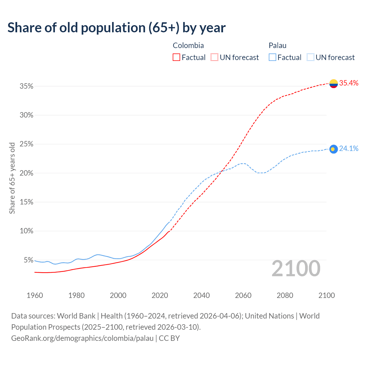 - The share of old-age demographic (65+) in Colombia is 9.78% vs 11.3% in Palau.