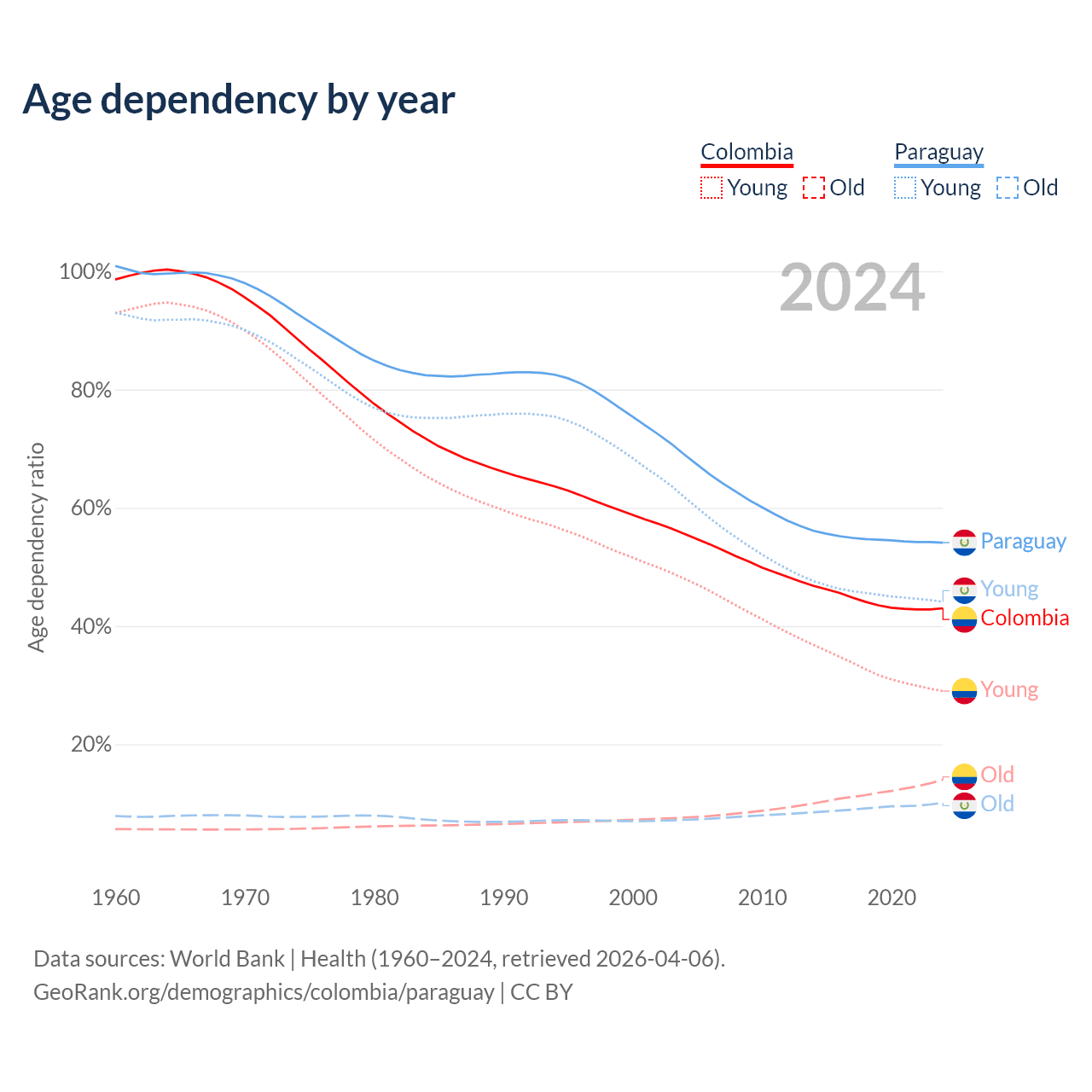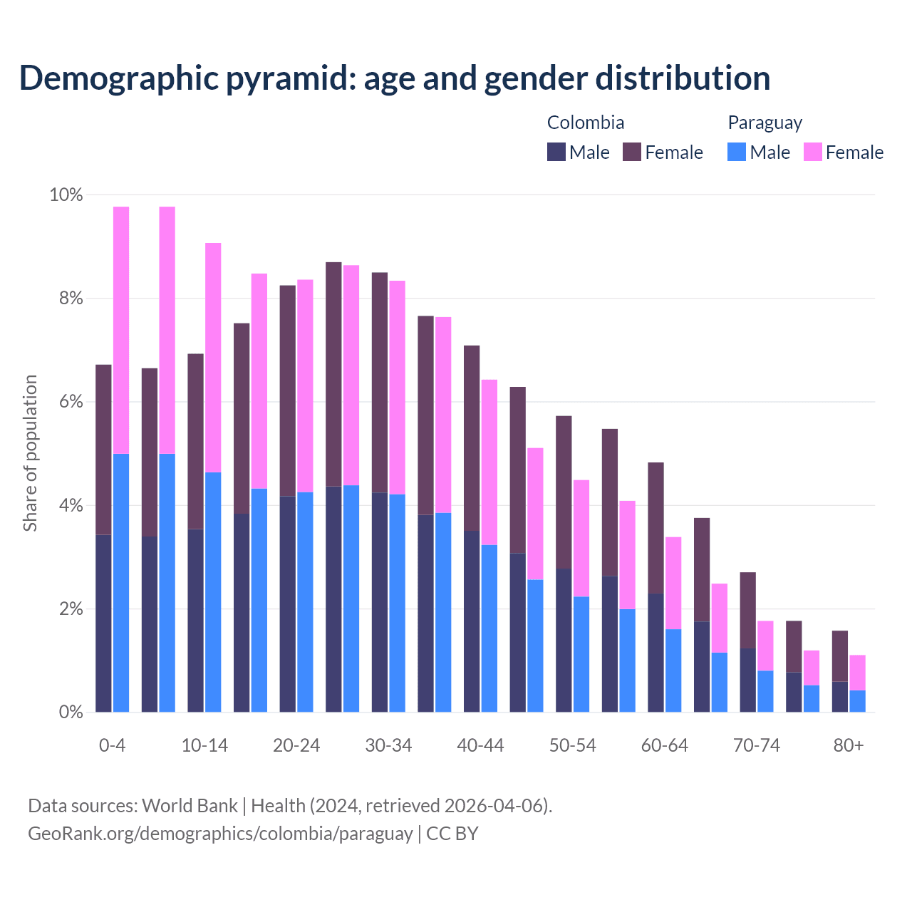 - The share of old-age demographic (65+) in Colombia is 9.78% vs 6.54% in Paraguay.