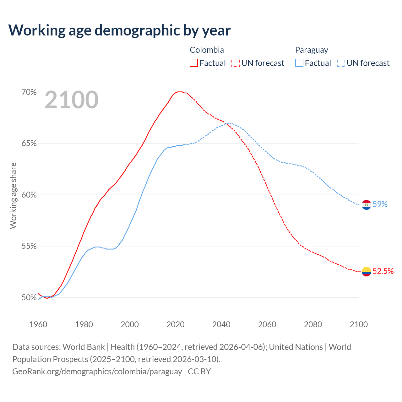 Median age Colombia vs Paraguay, 1960-2100