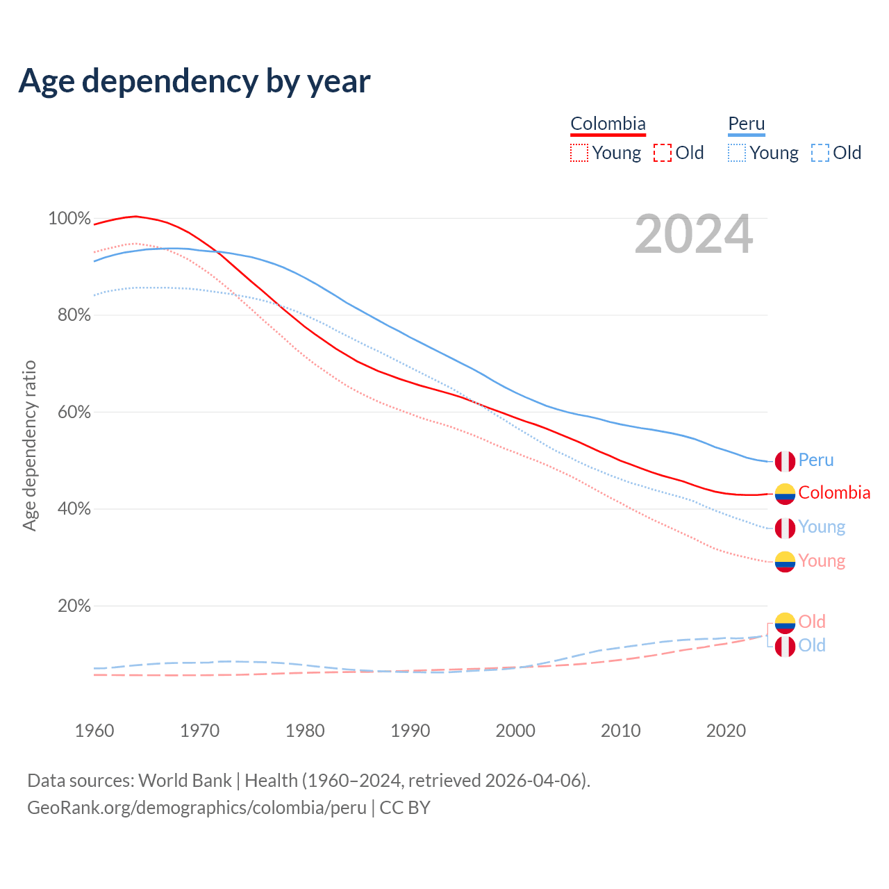 - Colombia is ranked 89/196 by median age (oldest to youngest) vs 97/196 for Peru.
