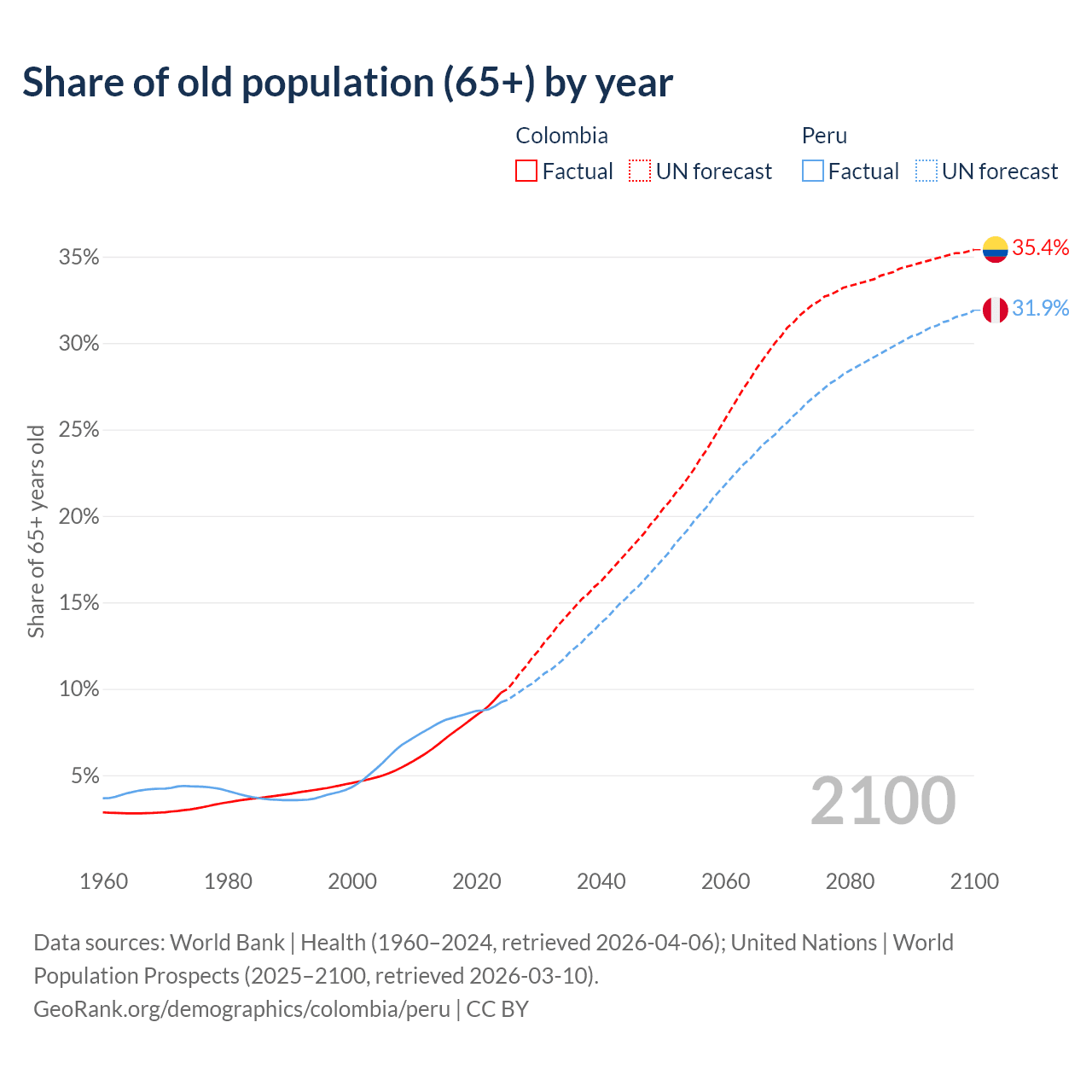 The share of older people aged 65 and over is 9.78% in Colombia and 9.23% in Peru. Life expectancy in Colombia compared to Peru .