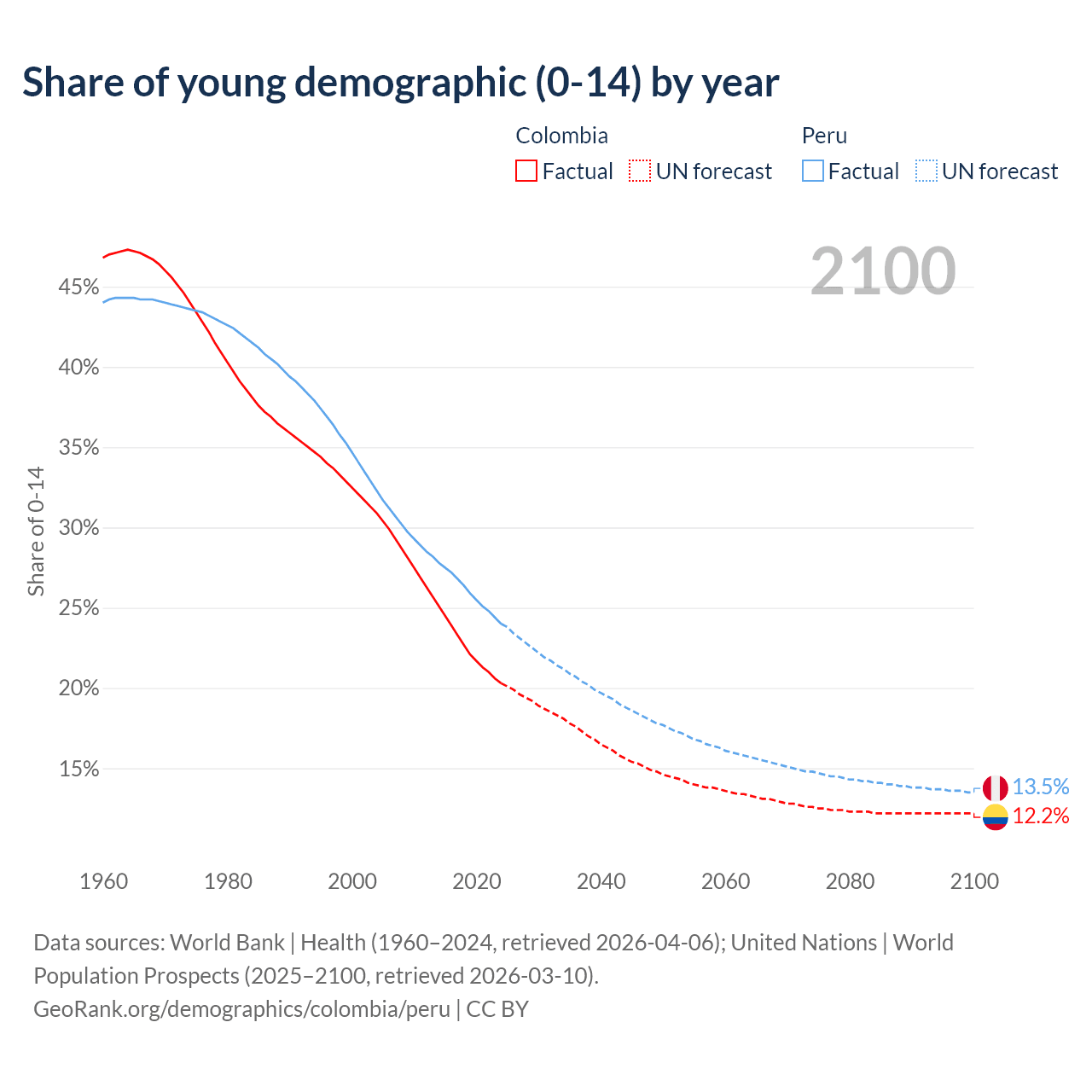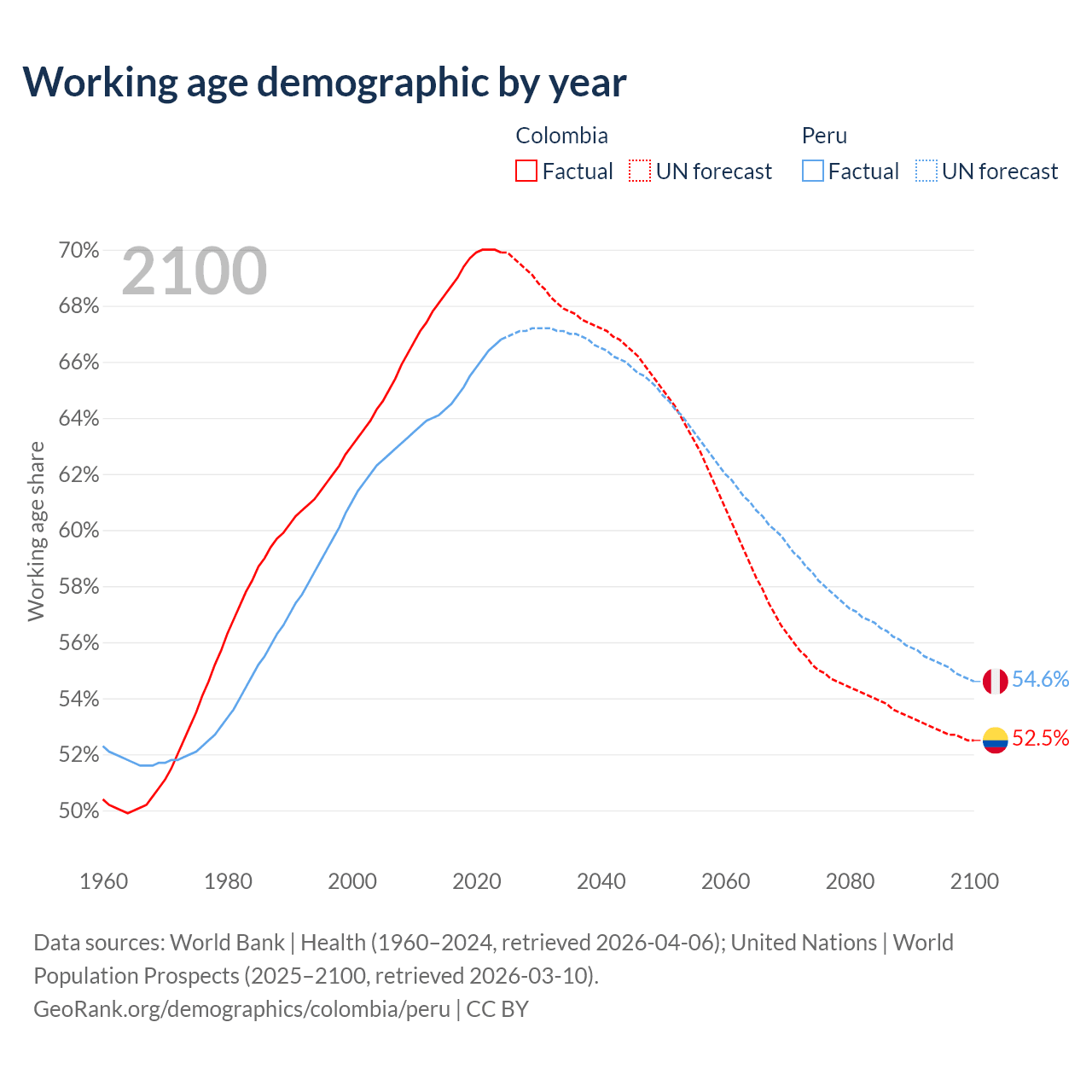 Median age Colombia vs Peru, 1960-2100