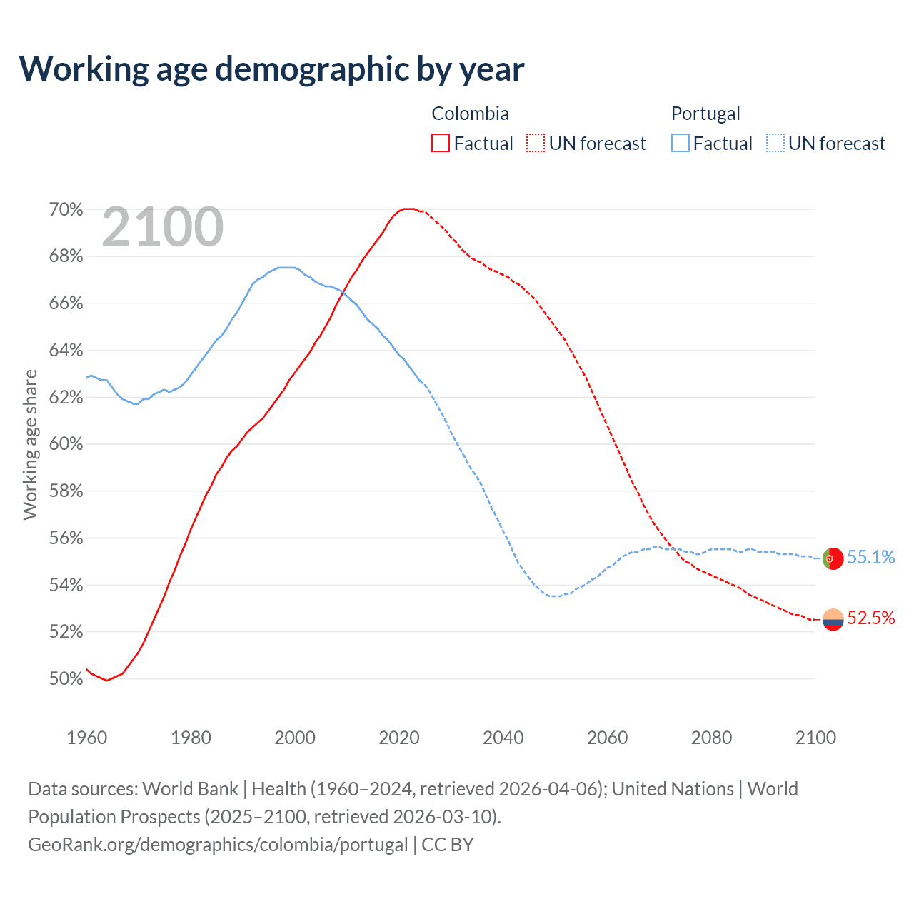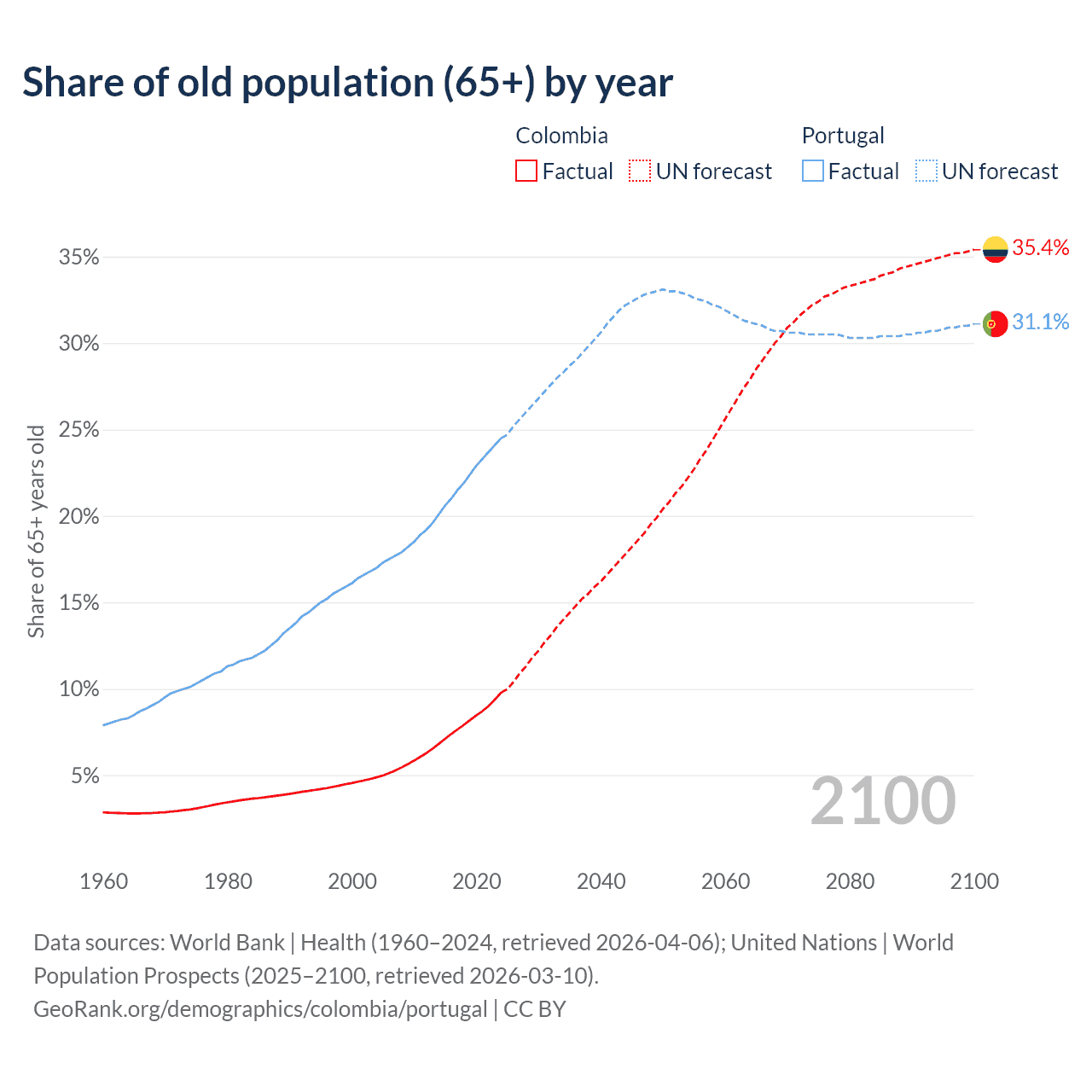 Median age Colombia vs Portugal, 1960-2100