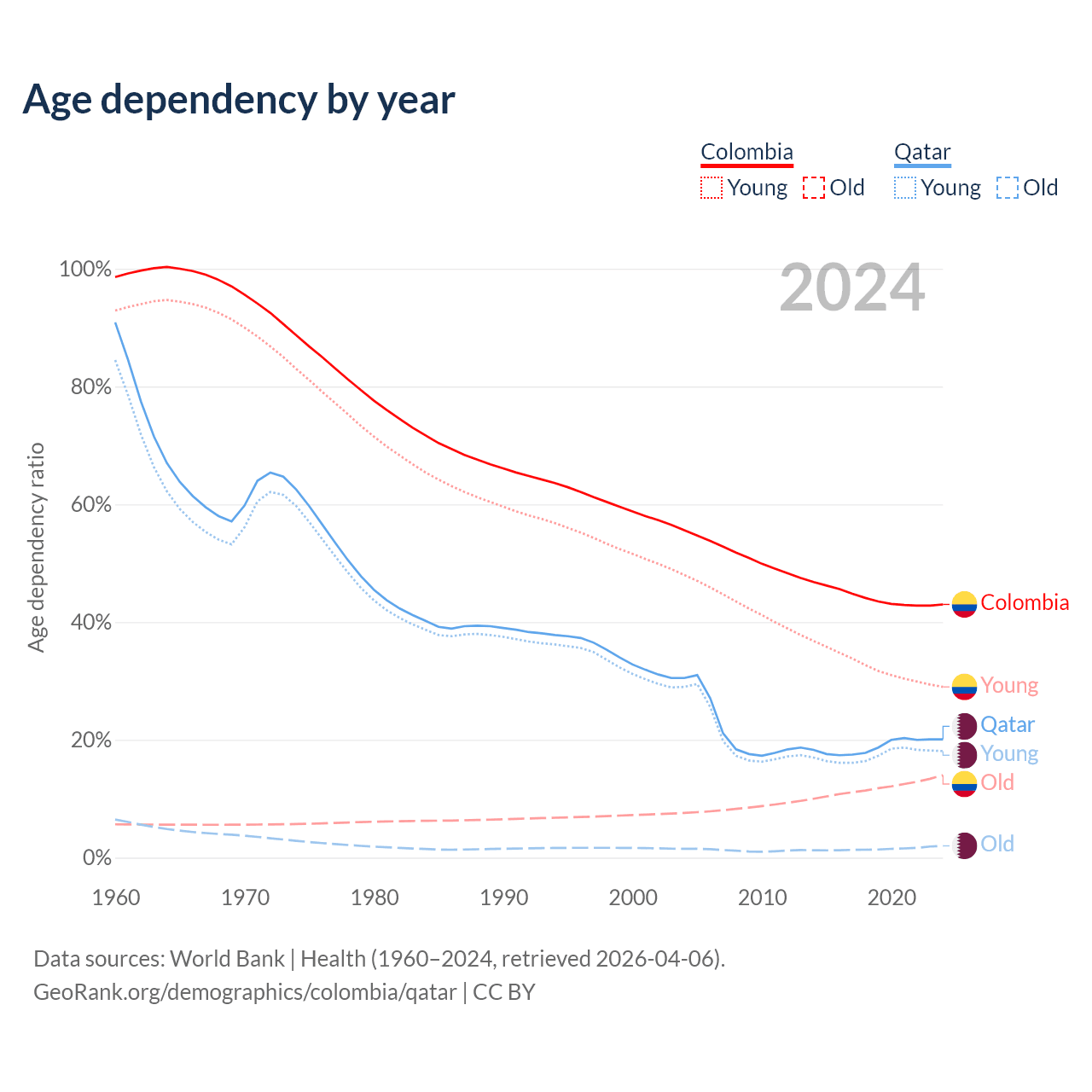 - The share of old-age demographic (65+) in Colombia is 9.78% vs 1.68% in Qatar.