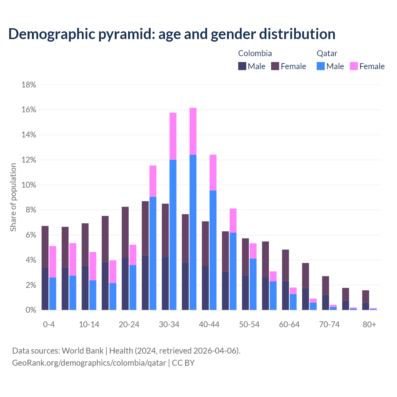 - Colombia is ranked 89/196 by median age (oldest to youngest) vs 78/196 for Qatar.