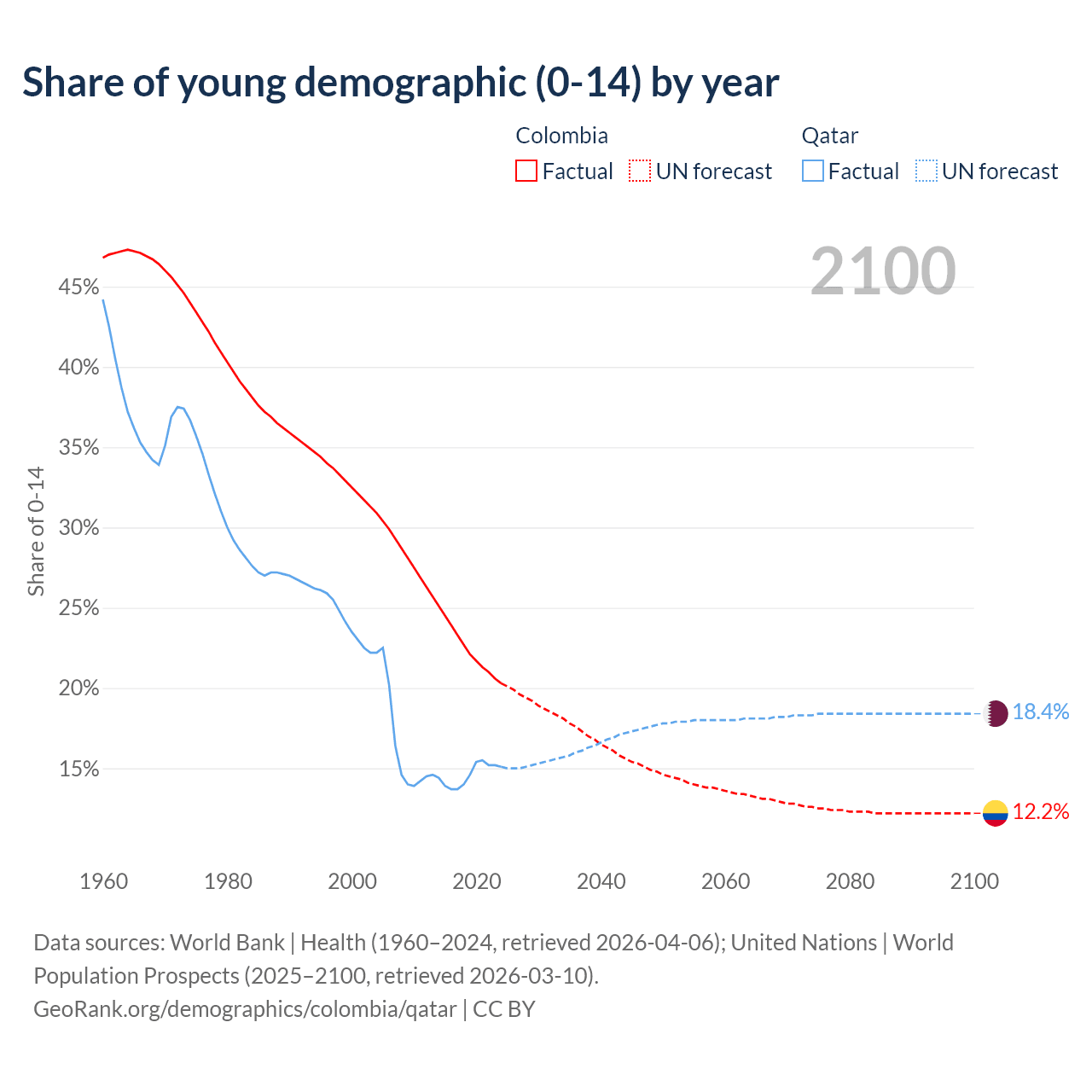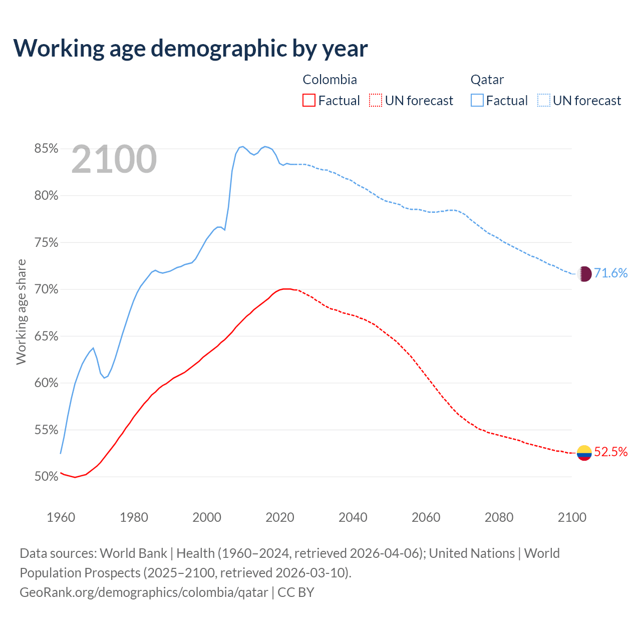 Median age Colombia vs Qatar, 1960-2100