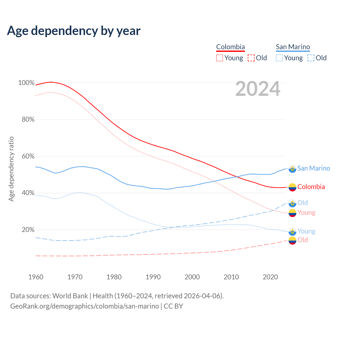 - The share of old-age demographic (65+) in Colombia is 9.78% vs 22.4% in San Marino.