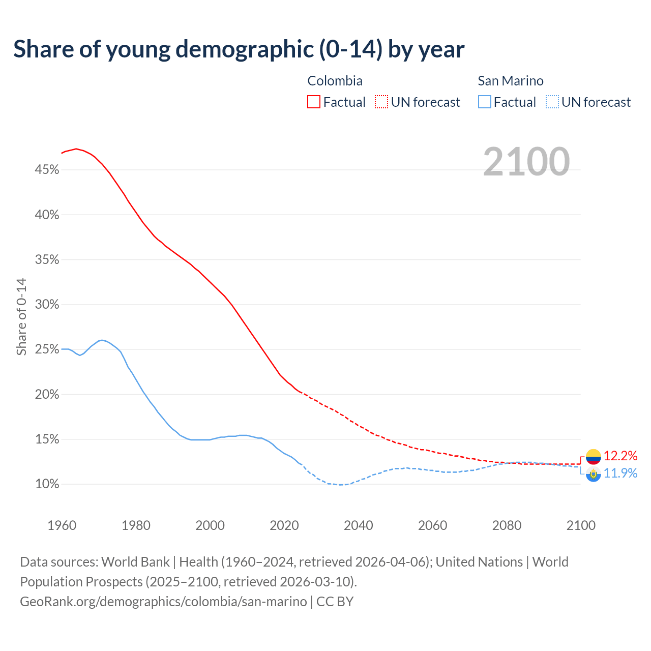 - The share of young demographic (0-15 years old) in Colombia is 20.3% vs 12.3% in San Marino.