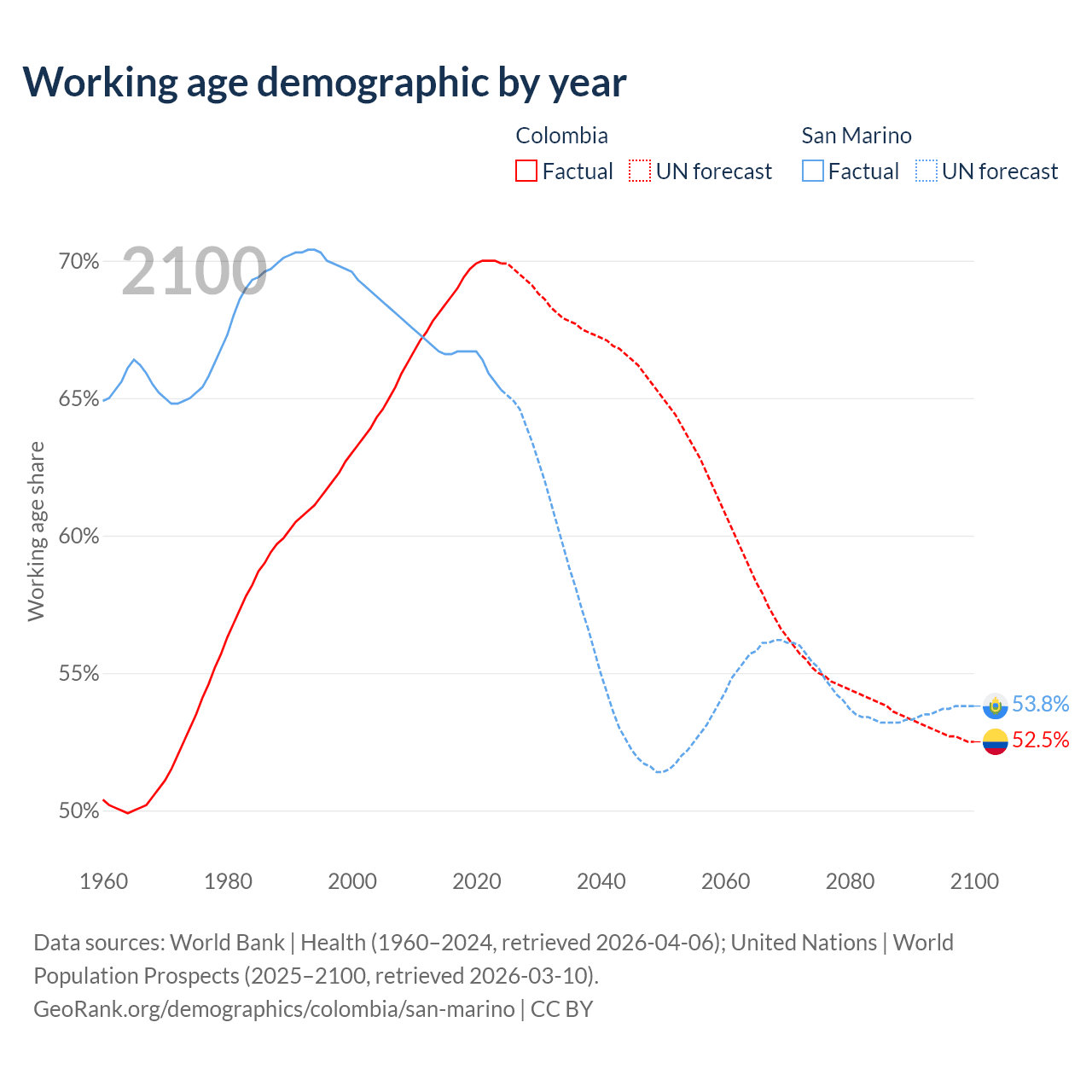 - Colombia has 37.8M working age adults (aged 15-64) vs 22.2K in San Marino.