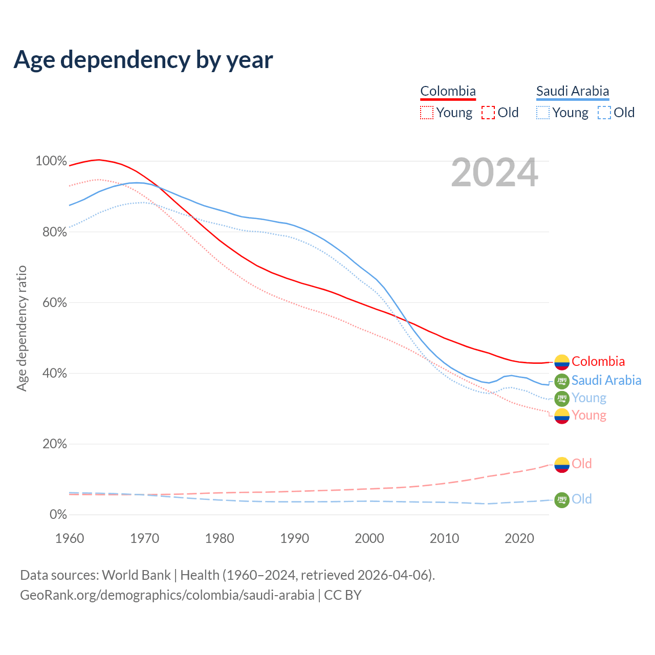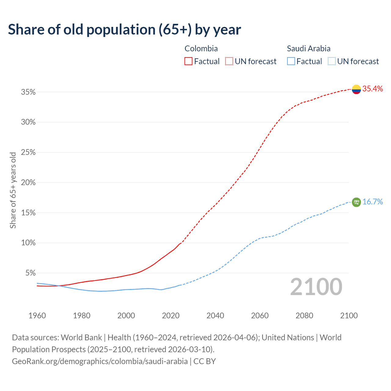 - The share of old-age demographic (65+) in Colombia is 9.78% vs 2.95% in Saudi Arabia.