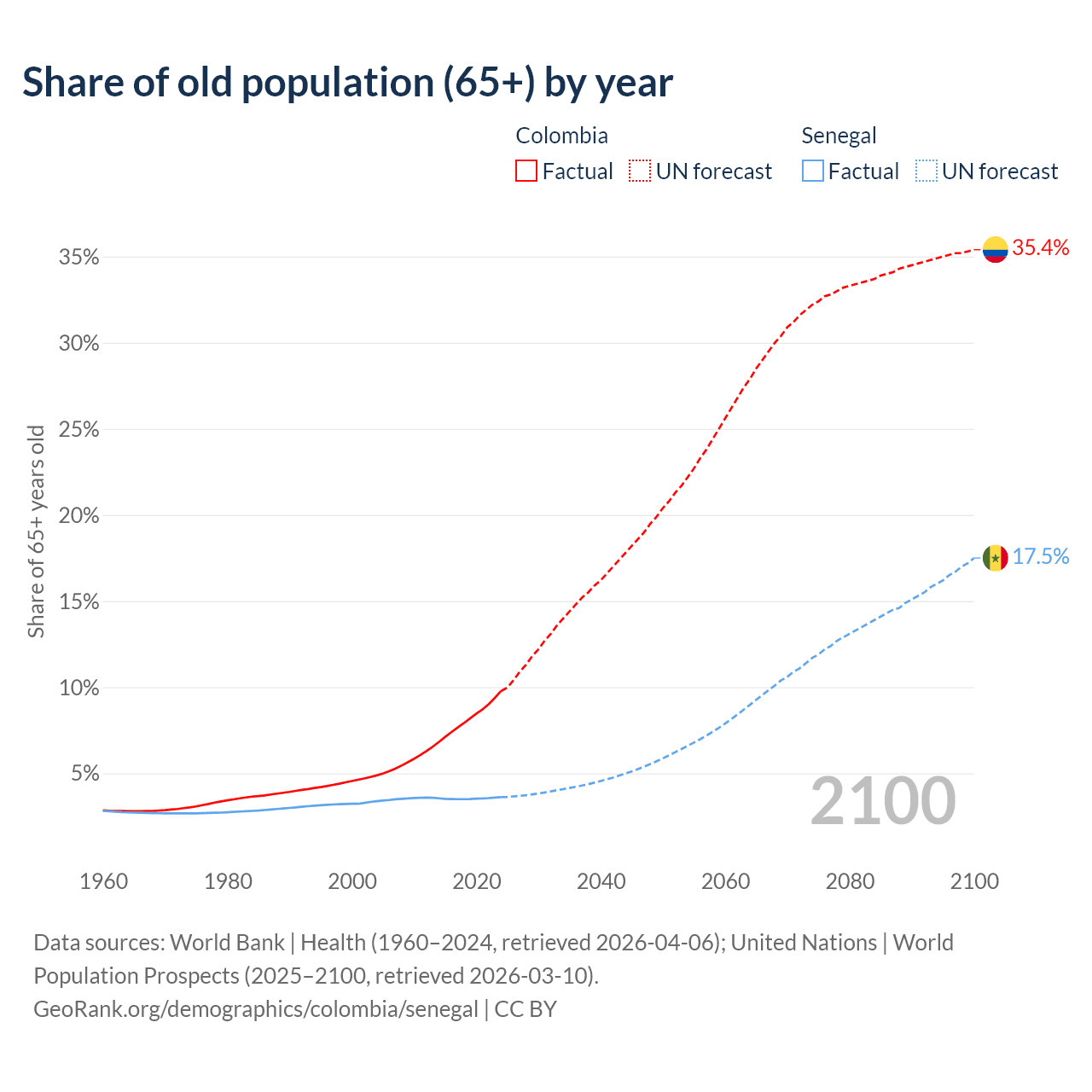 - The share of old-age demographic (65+) in Colombia is 9.78% vs 3.62% in Senegal.