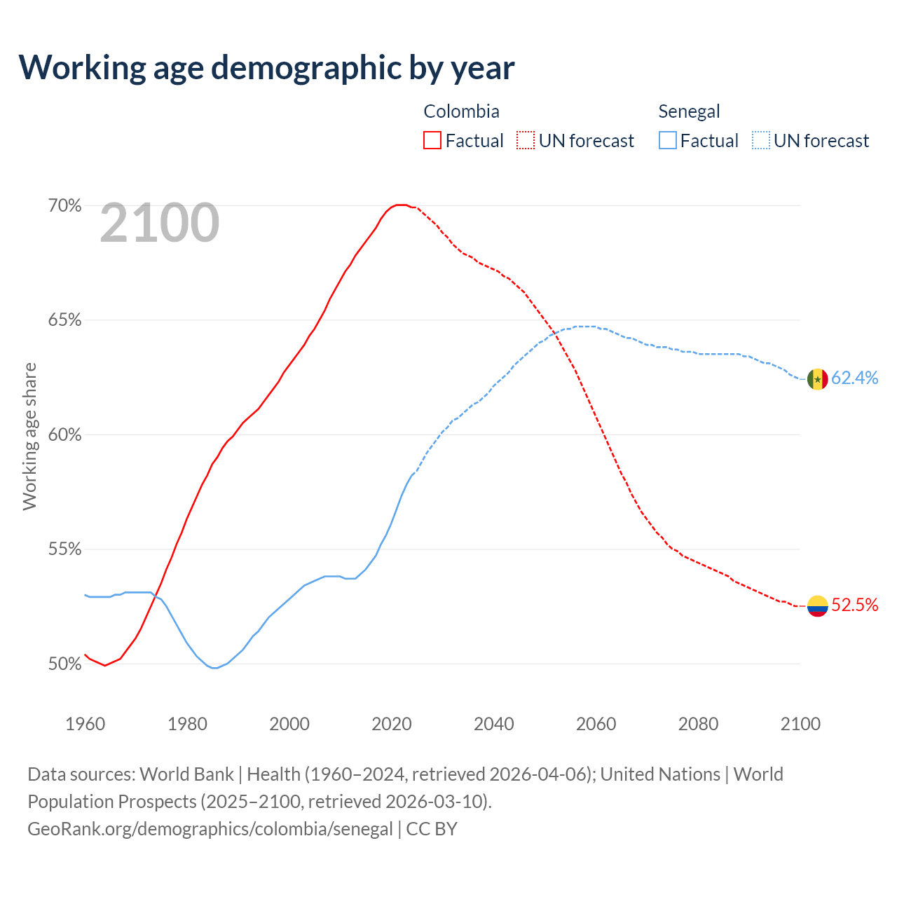 Median age Colombia vs Senegal, 1960-2100
