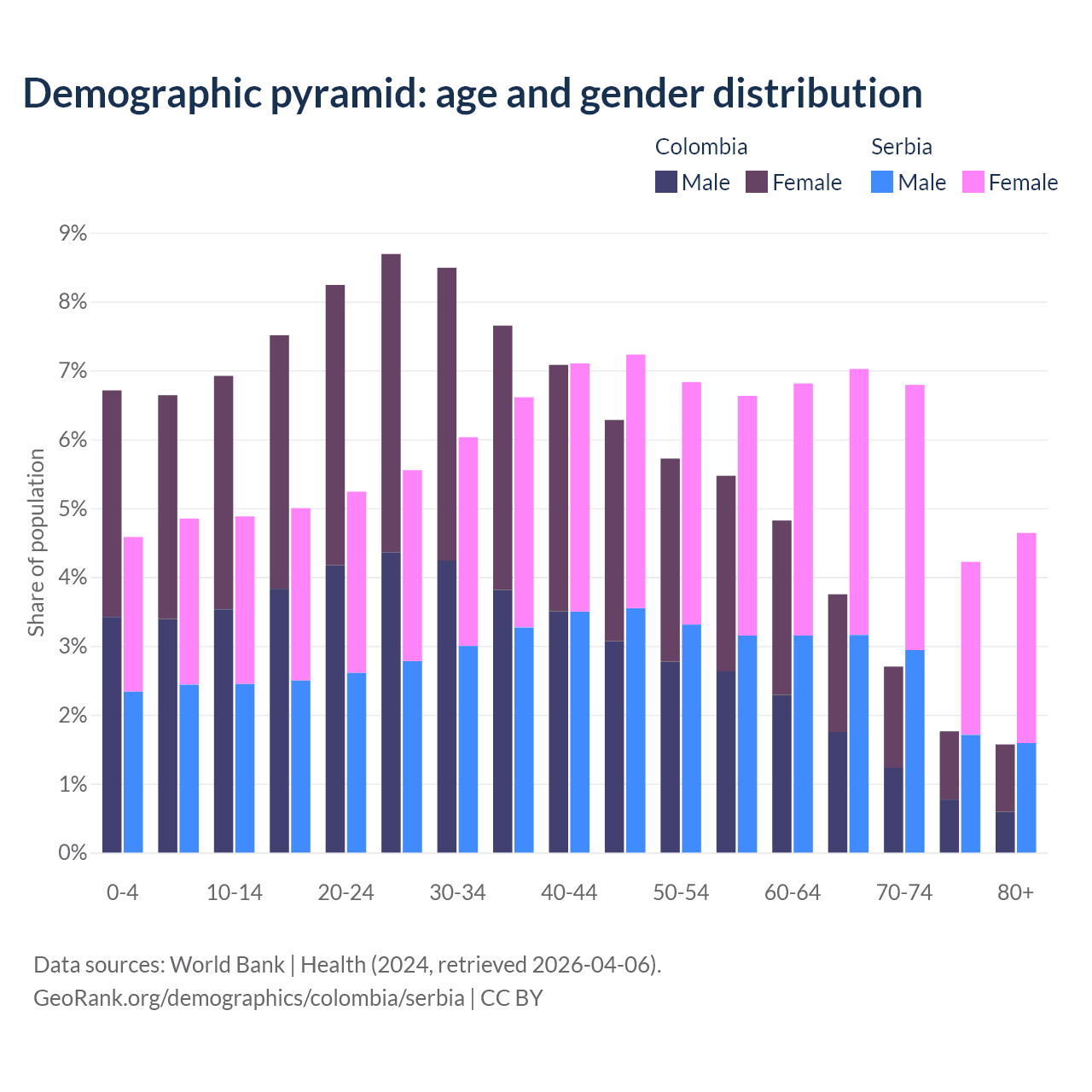 - The median age in Colombia is 33.1 years compared to 45.1 years in Serbia.