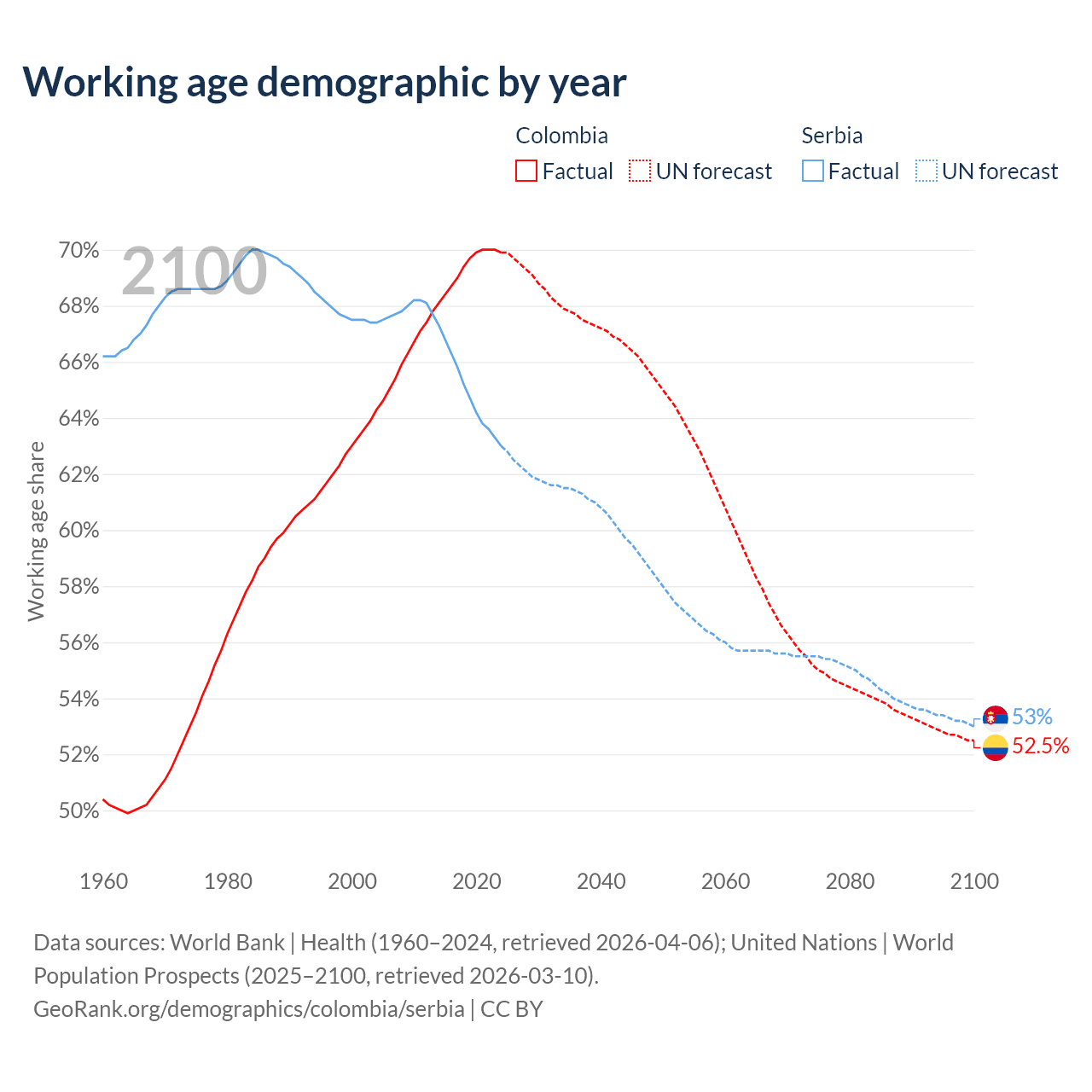 - Colombia has 37.8M working age adults (aged 15-64) vs 4.09M in Serbia.