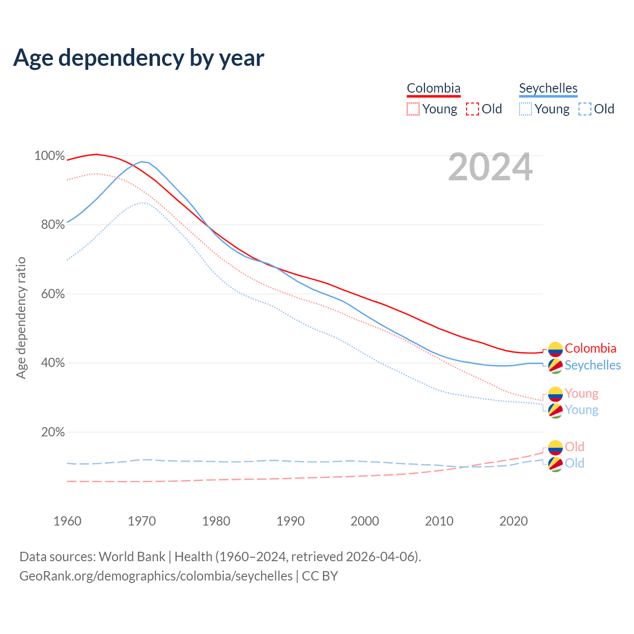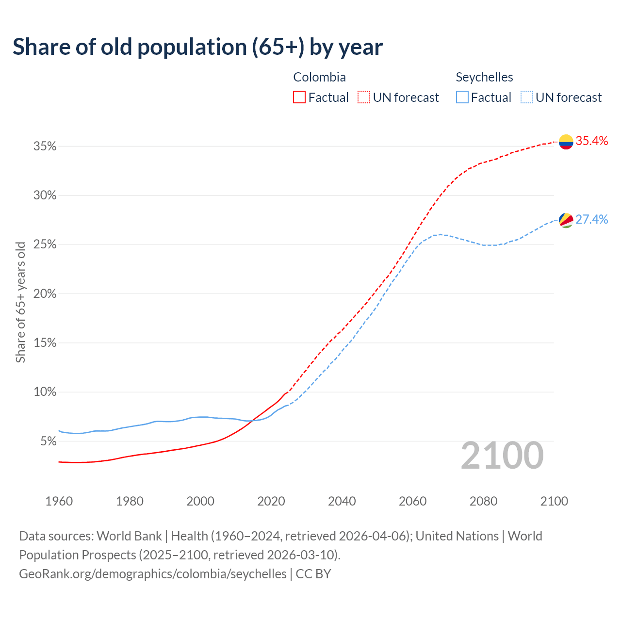 The share of older people aged 65 and over is 9.78% in Colombia and 8.54% in the Seychelles. Life expectancy in Colombia compared to the Seychelles .