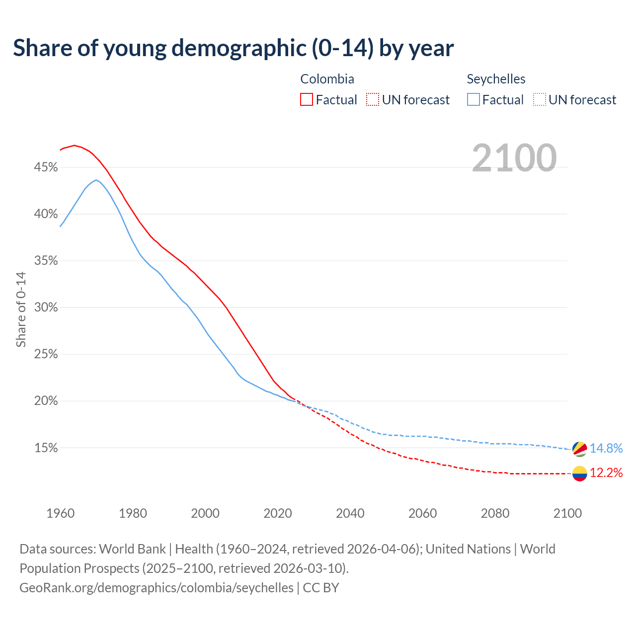 - The share of young demographic (0-15 years old) in Colombia is 20.3% vs 20% in the Seychelles.