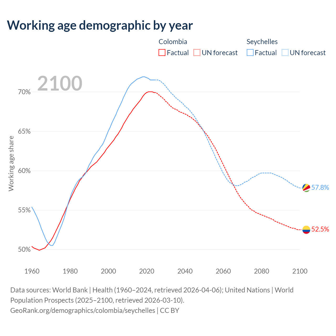 - Colombia has 37.8M working age adults (aged 15-64) vs 90.3K in the Seychelles.