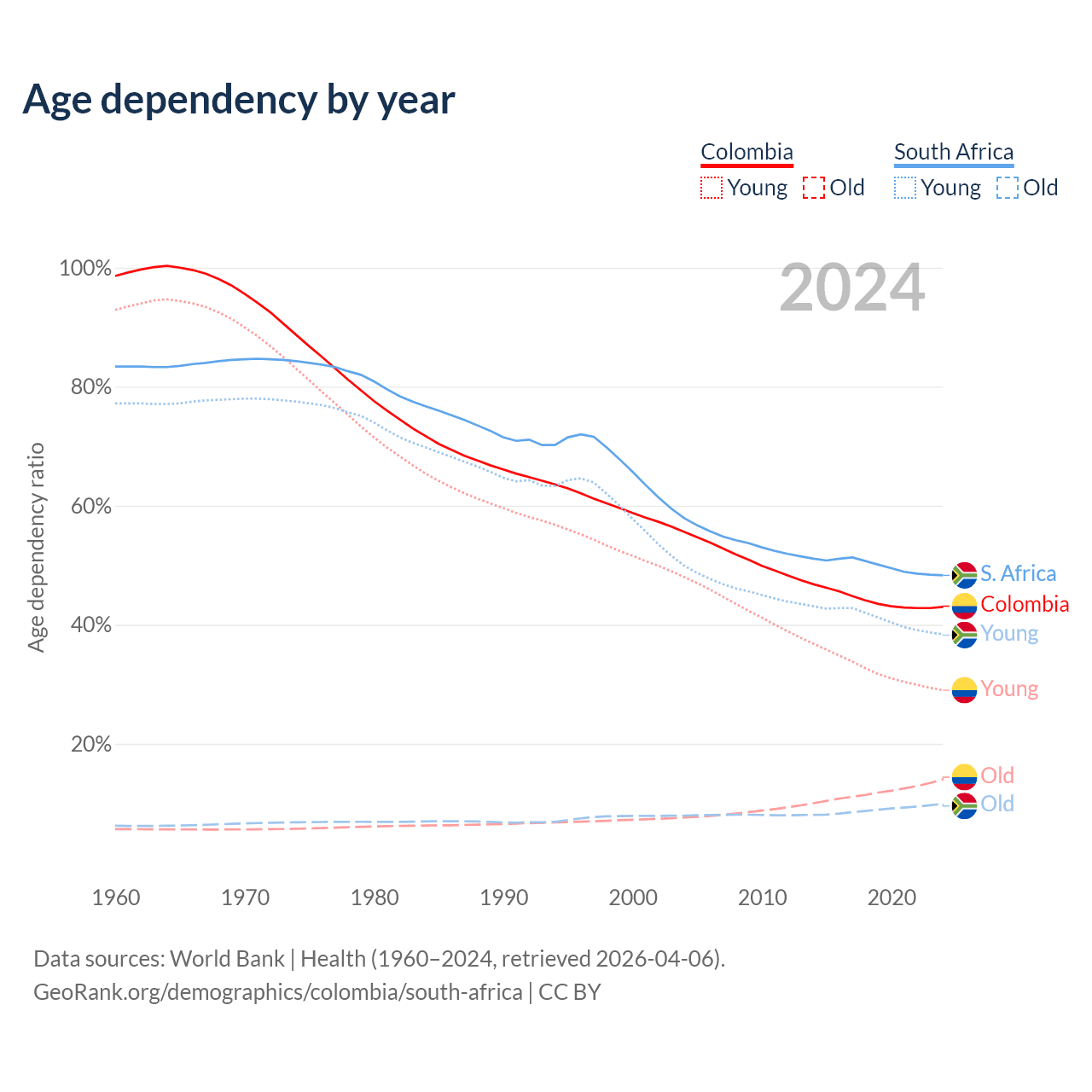 Data sources: World Bank | Health (1960–2024, retrieved 2026-04-06); U.S. Census Bureau (1960–2024, retrieved 2026-02-08).