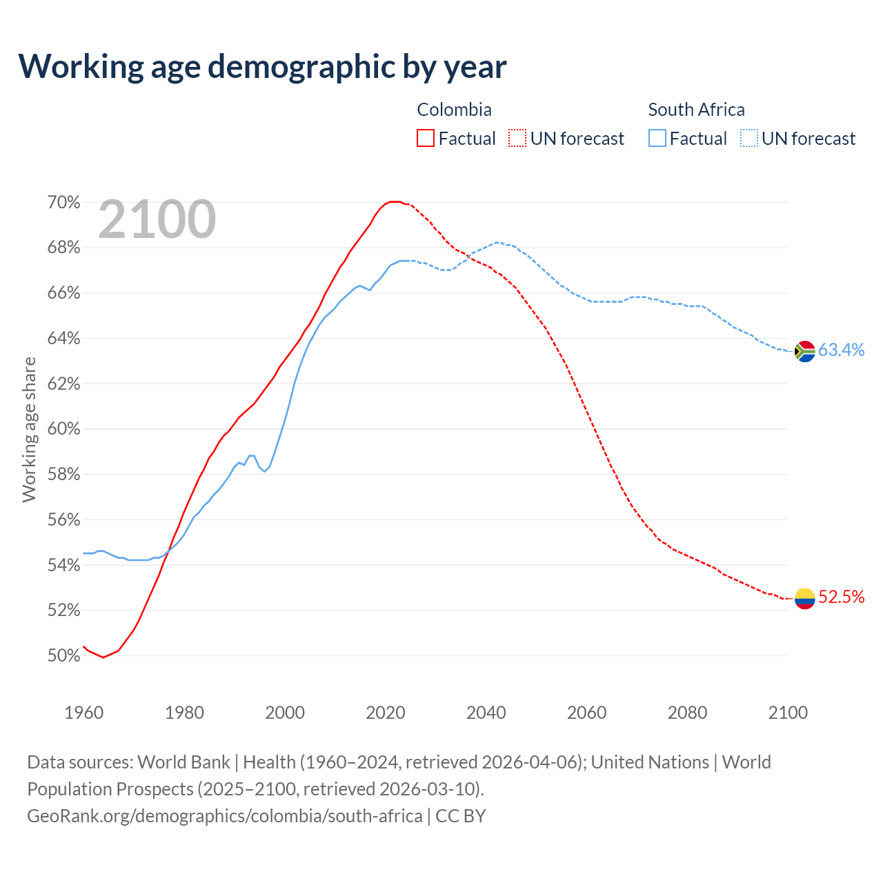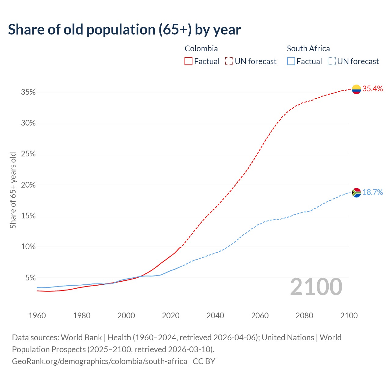 Median age Colombia vs South Africa, 1960-2100