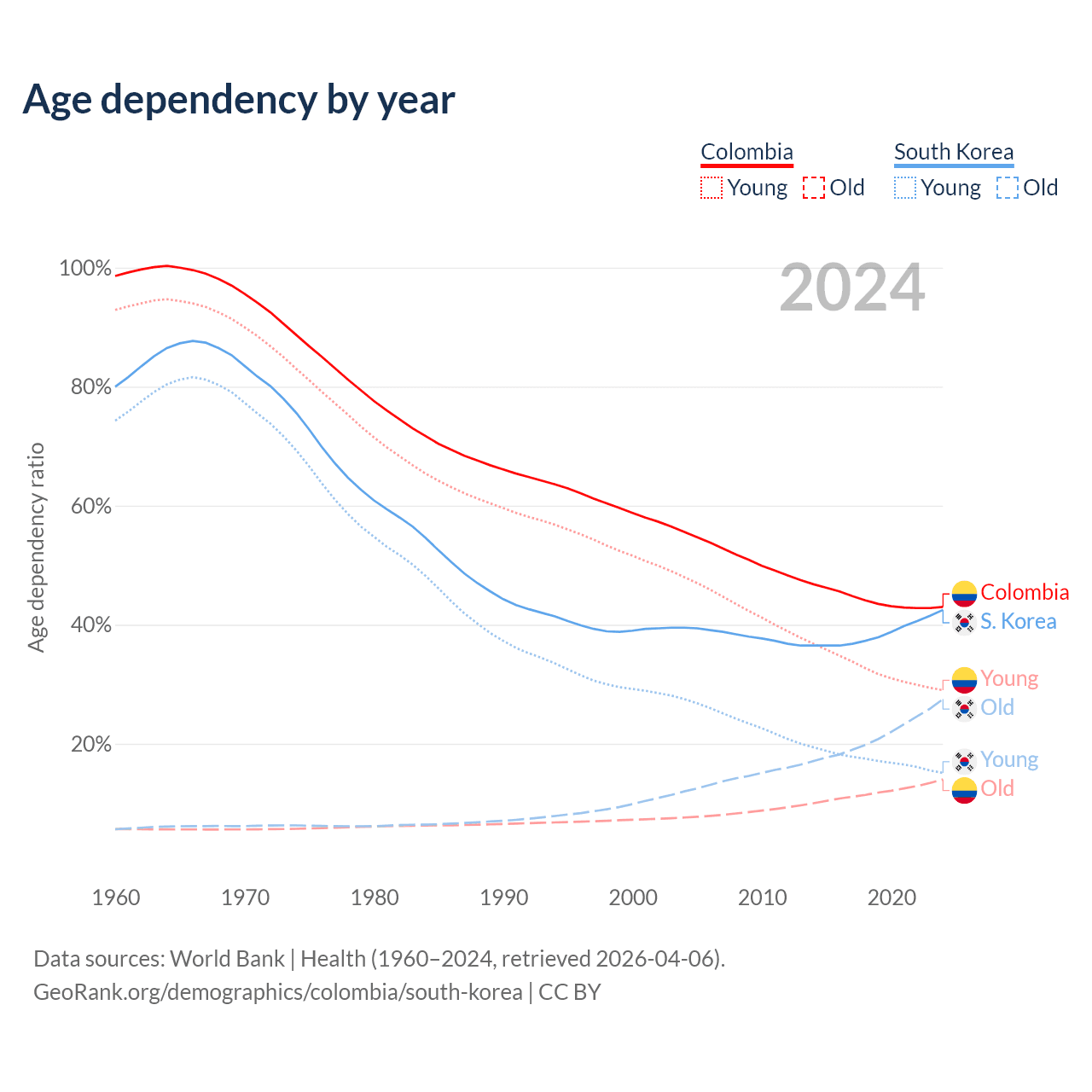 - The median age in Colombia is 33.1 years compared to 46.1 years in South Korea.