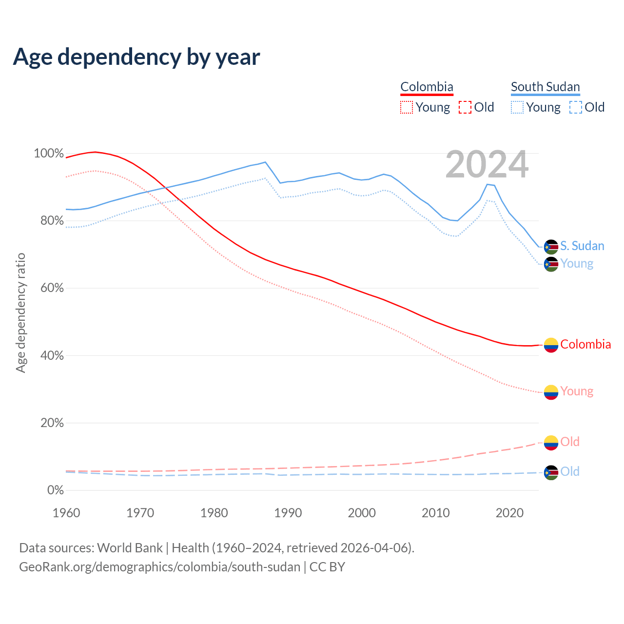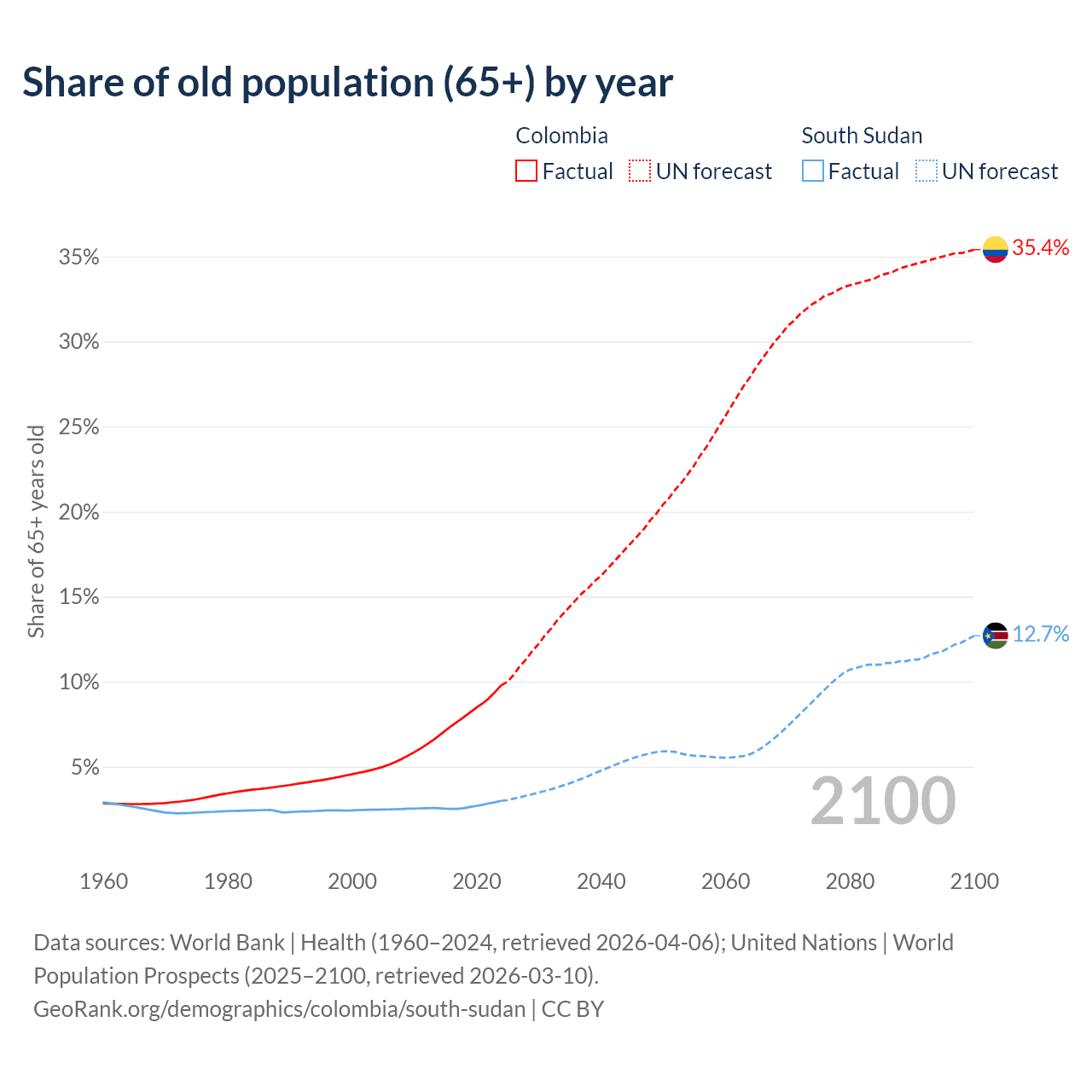 The share of older people aged 65 and over is 9.78% in Colombia and 2.99% in South Sudan. Life expectancy in Colombia compared to South Sudan .