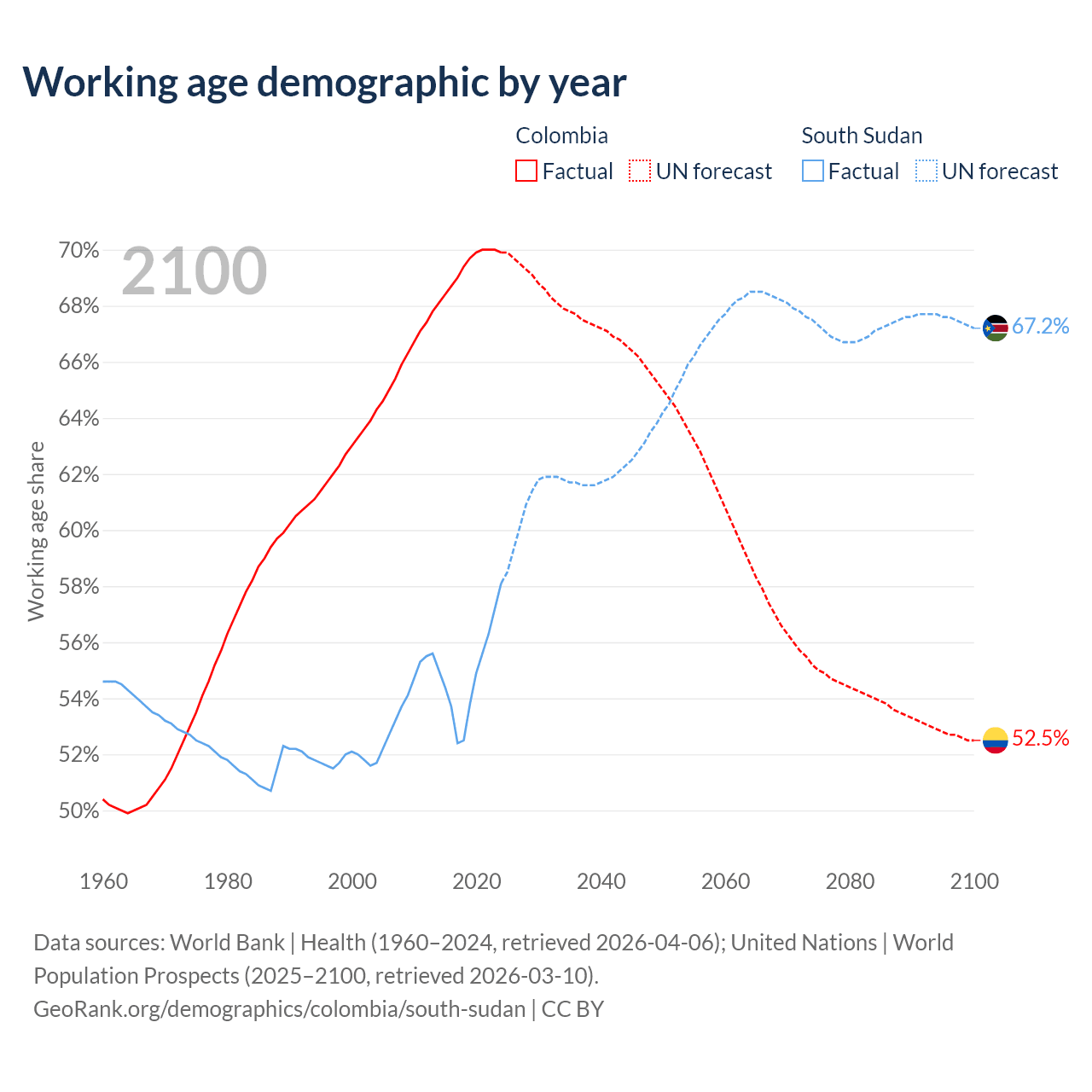 - Colombia has 37.8M working age adults (aged 15-64) vs 7.27M in South Sudan.