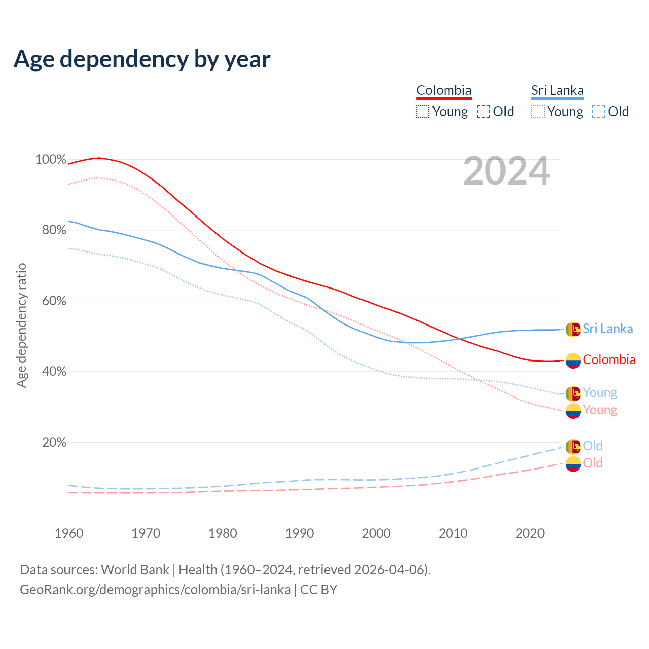 - Colombia is ranked 89/196 by median age (oldest to youngest) vs 81/196 for Sri Lanka.