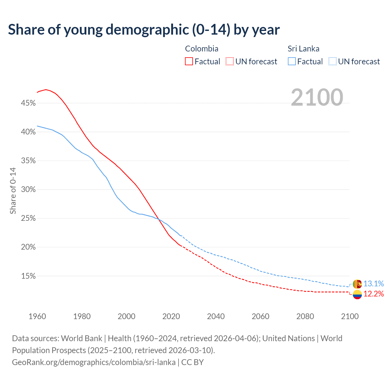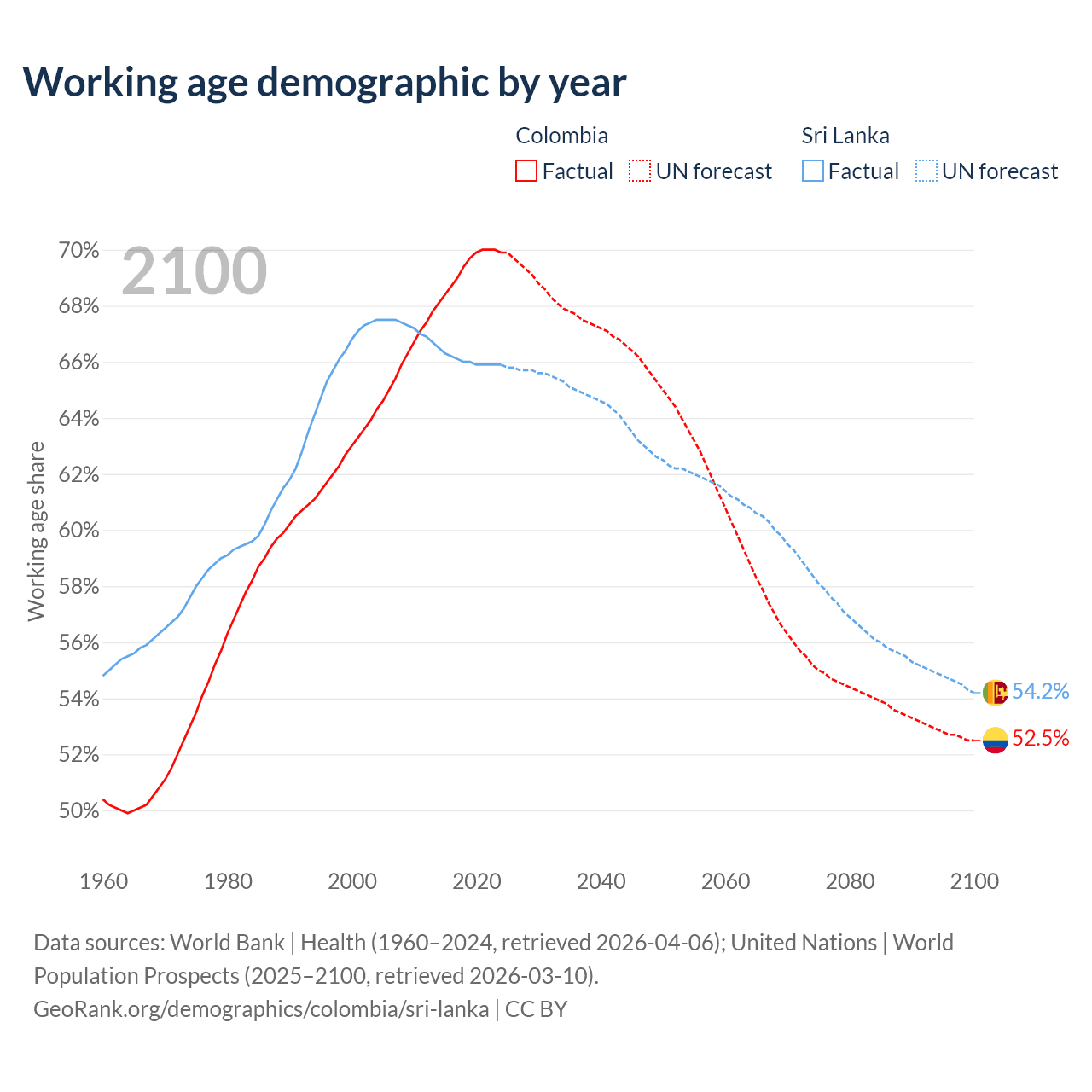 Median age Colombia vs Sri Lanka, 1960-2100