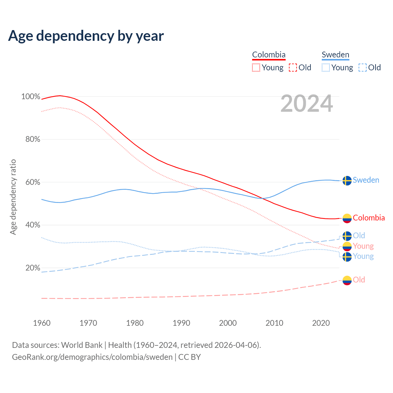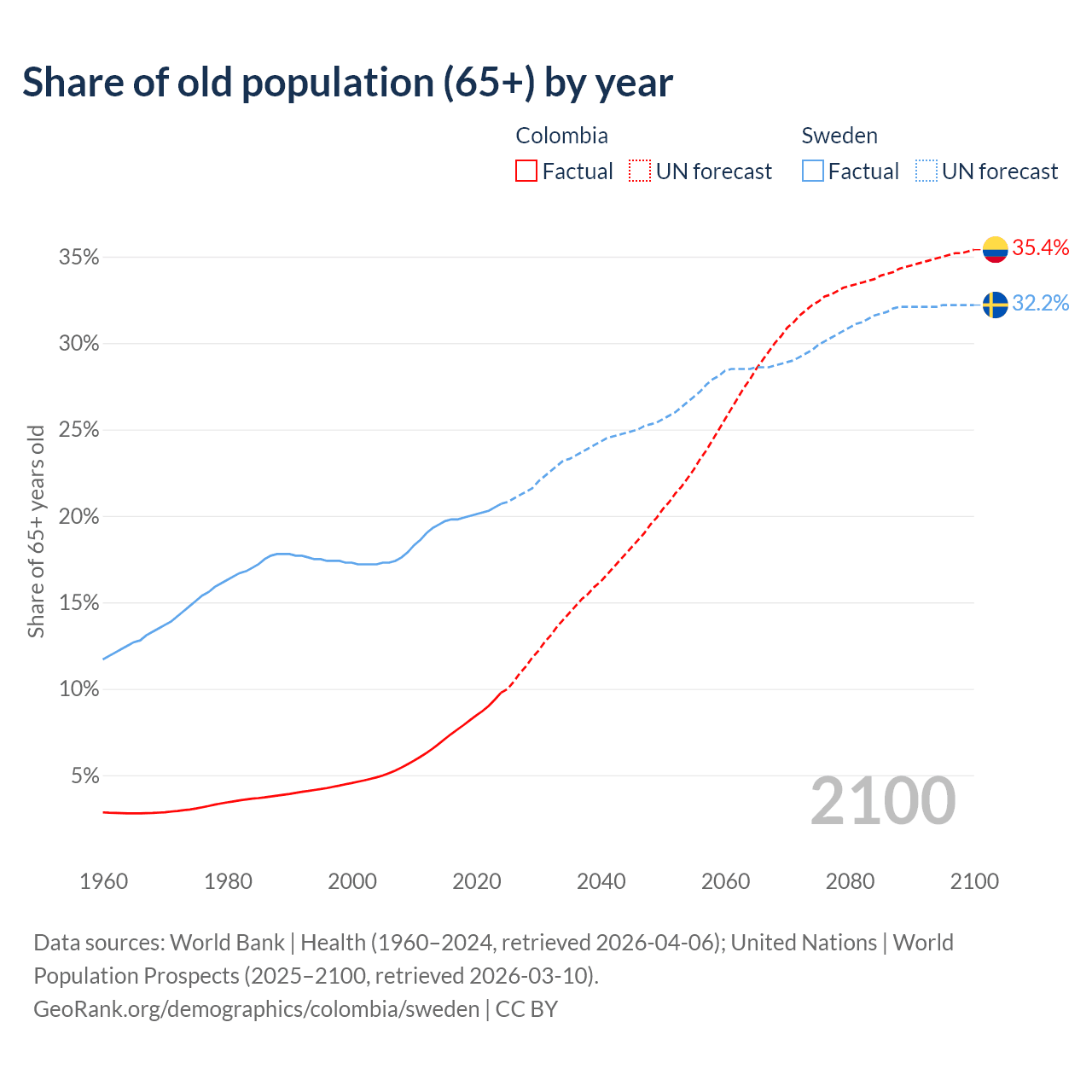 - The share of old-age demographic (65+) in Colombia is 9.78% vs 20.7% in Sweden.
