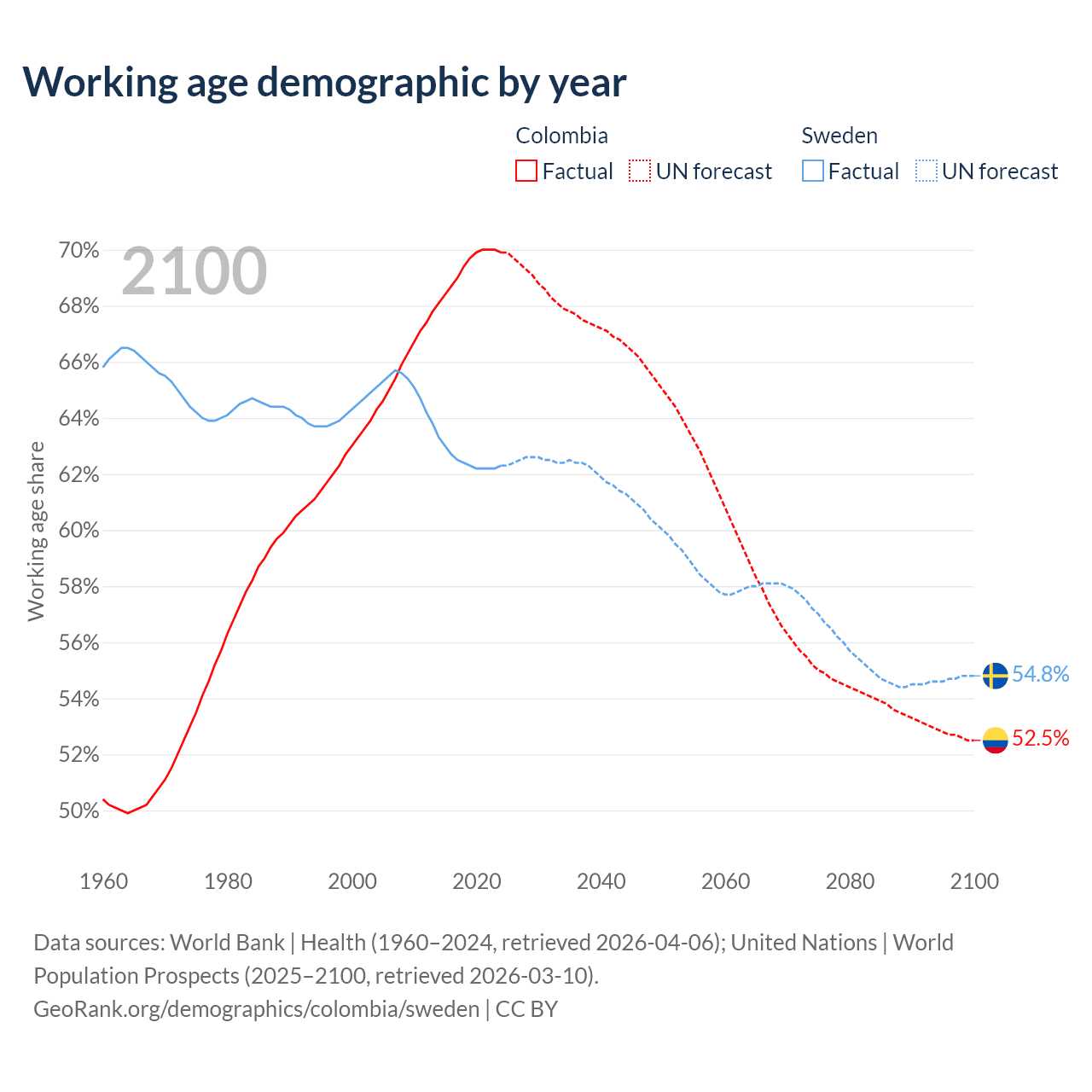 Median age Colombia vs Sweden, 1960-2100