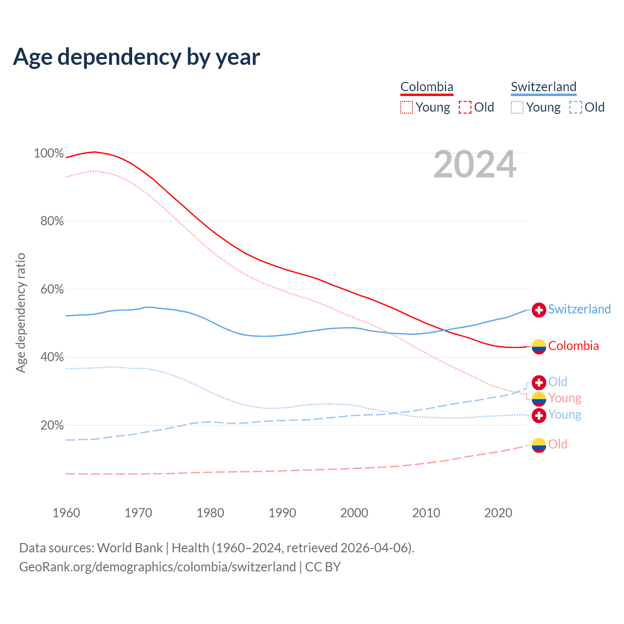The share of older people aged 65 and over is 9.78% in Colombia and 20% in Switzerland. Life expectancy in Colombia compared to Switzerland .