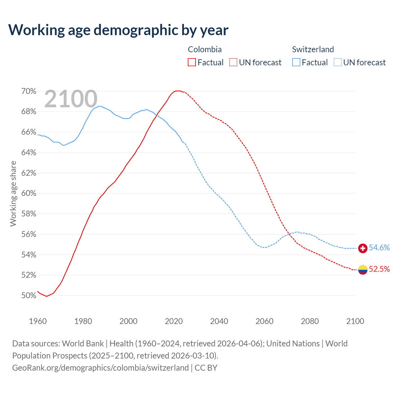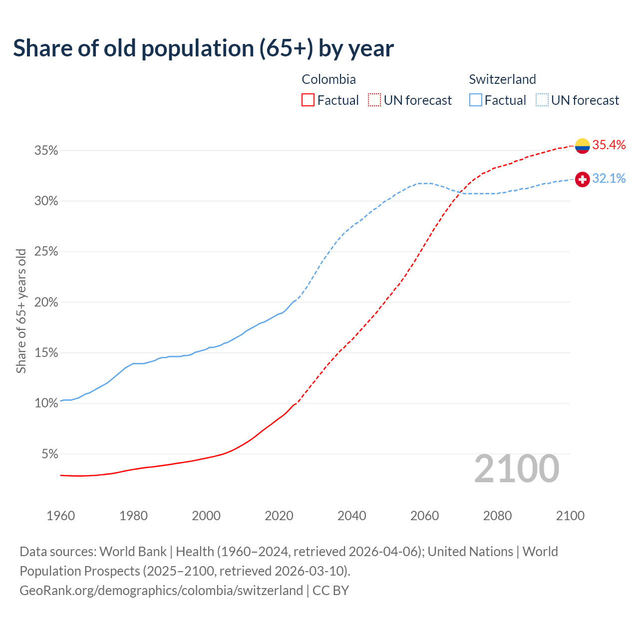 Median age Colombia vs Switzerland, 1960-2100