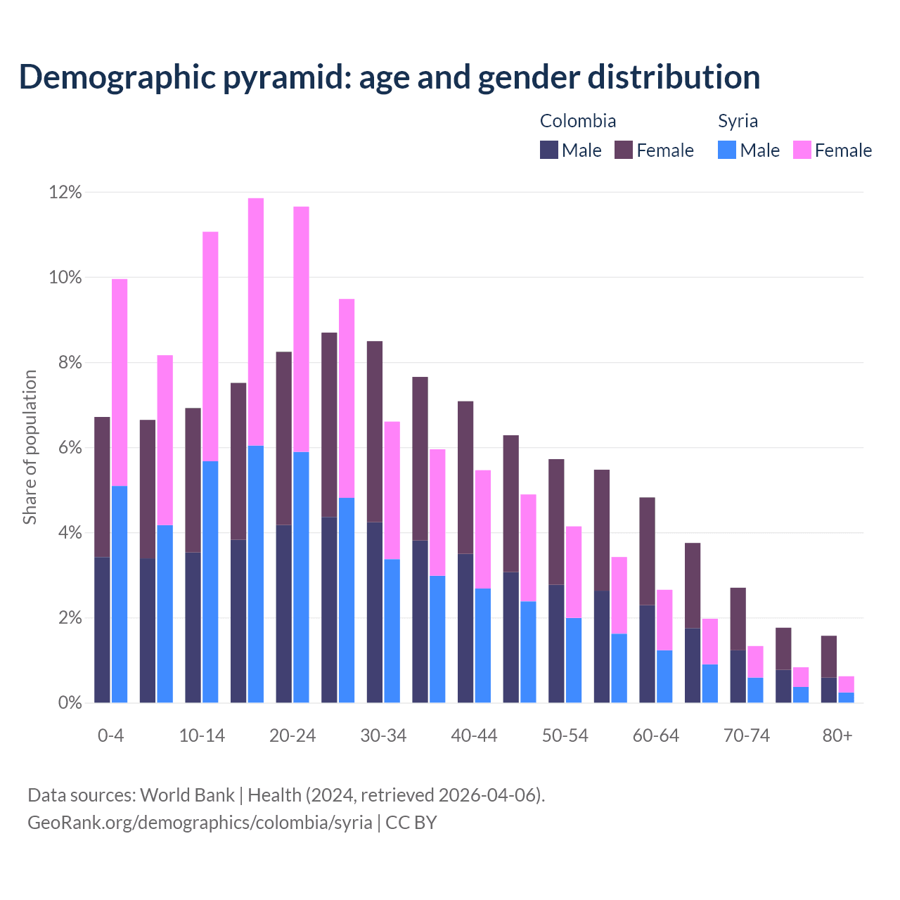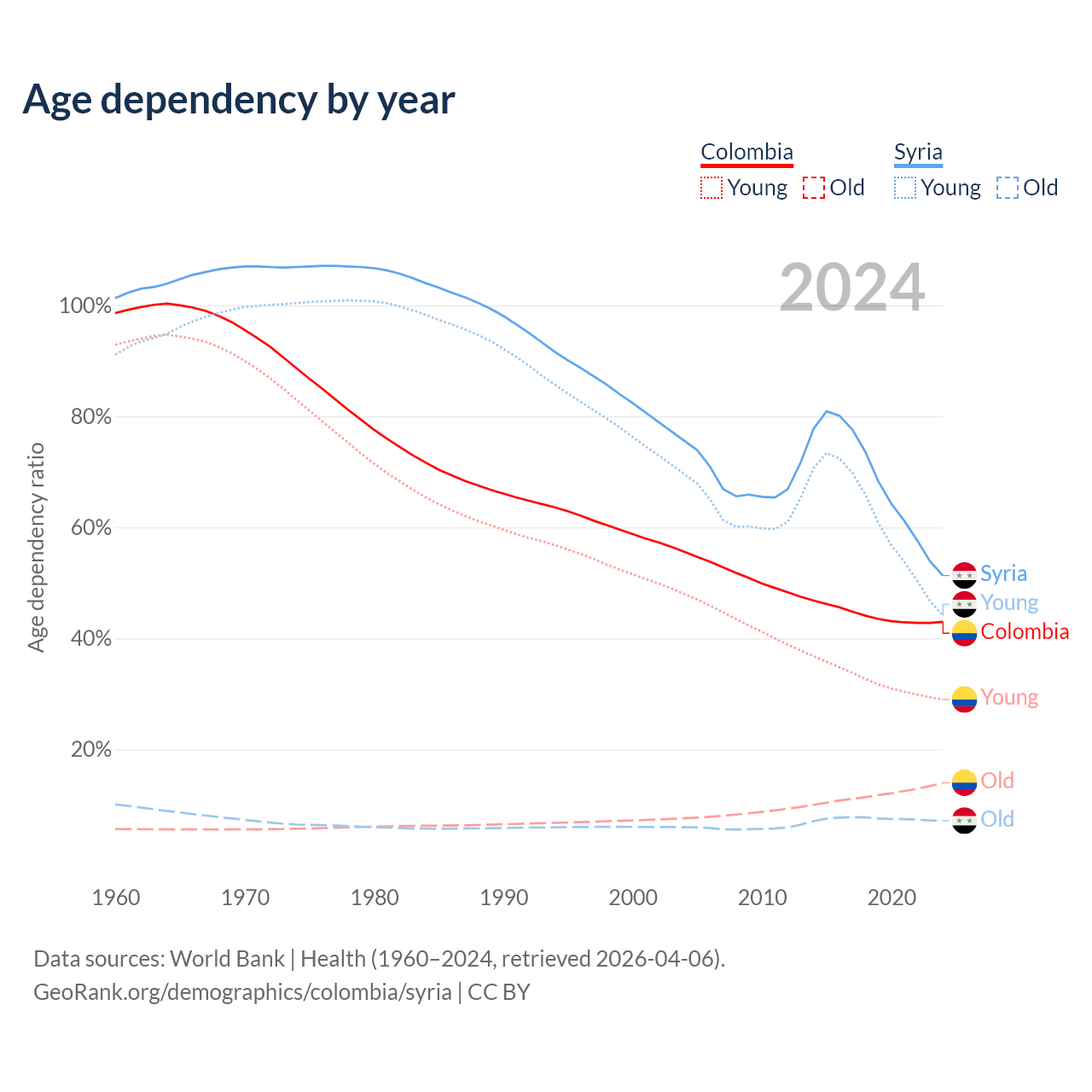 - The share of old-age demographic (65+) in Colombia is 9.78% vs 4.74% in Syria.