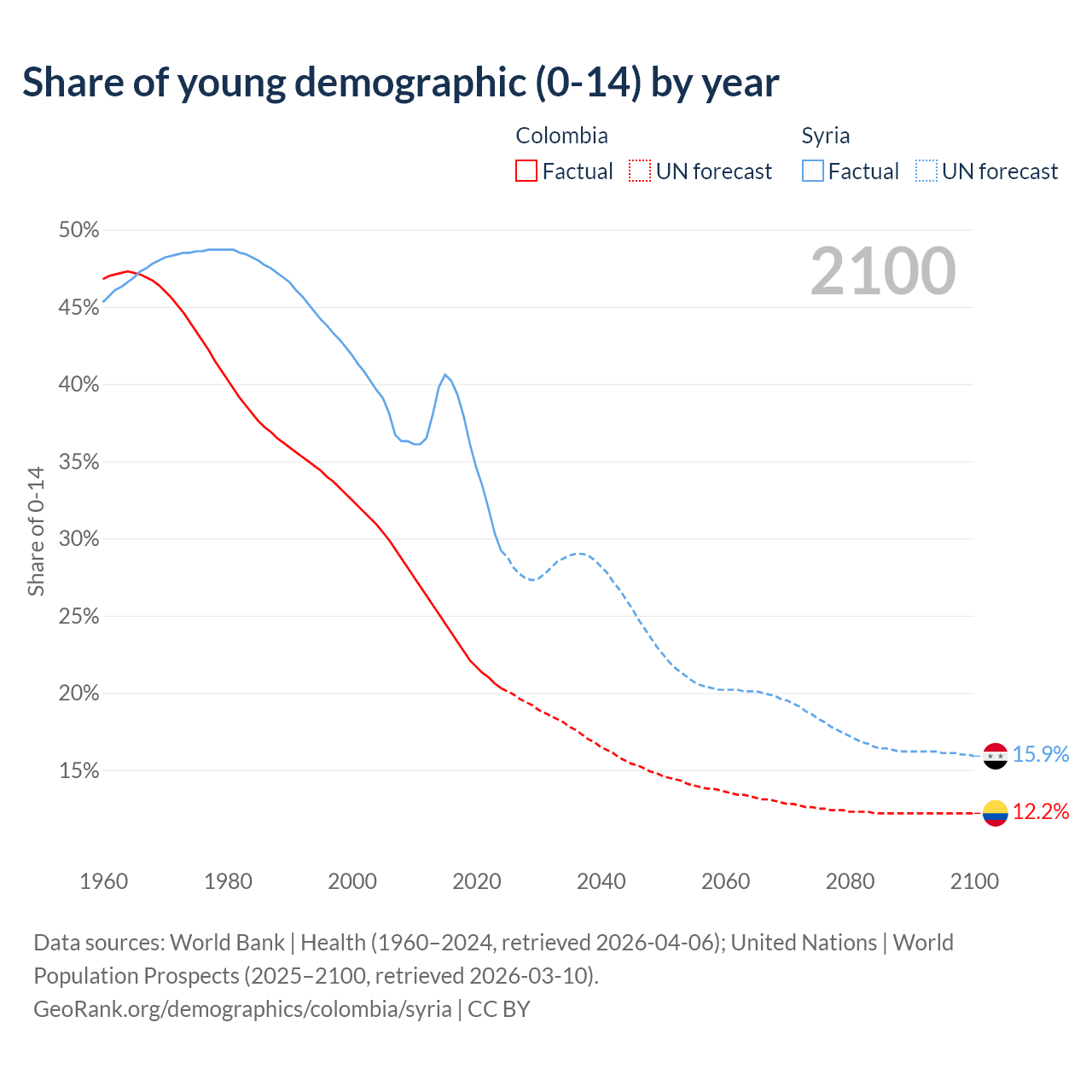 - The share of young demographic (0-15 years old) in Colombia is 20.3% vs 29.2% in Syria.