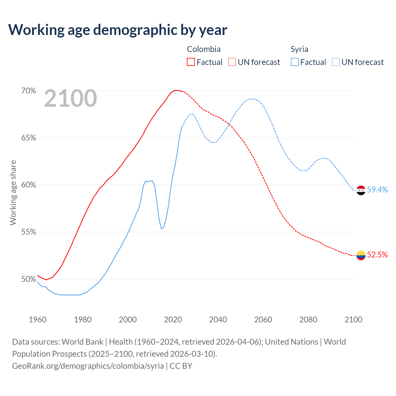 - Colombia has 37.8M working age adults (aged 15-64) vs 17.7M in Syria.