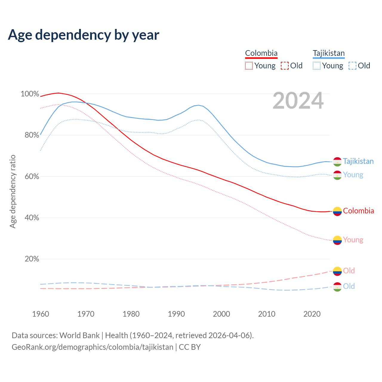 - The share of old-age demographic (65+) in Colombia is 9.78% vs 3.85% in Tajikistan.