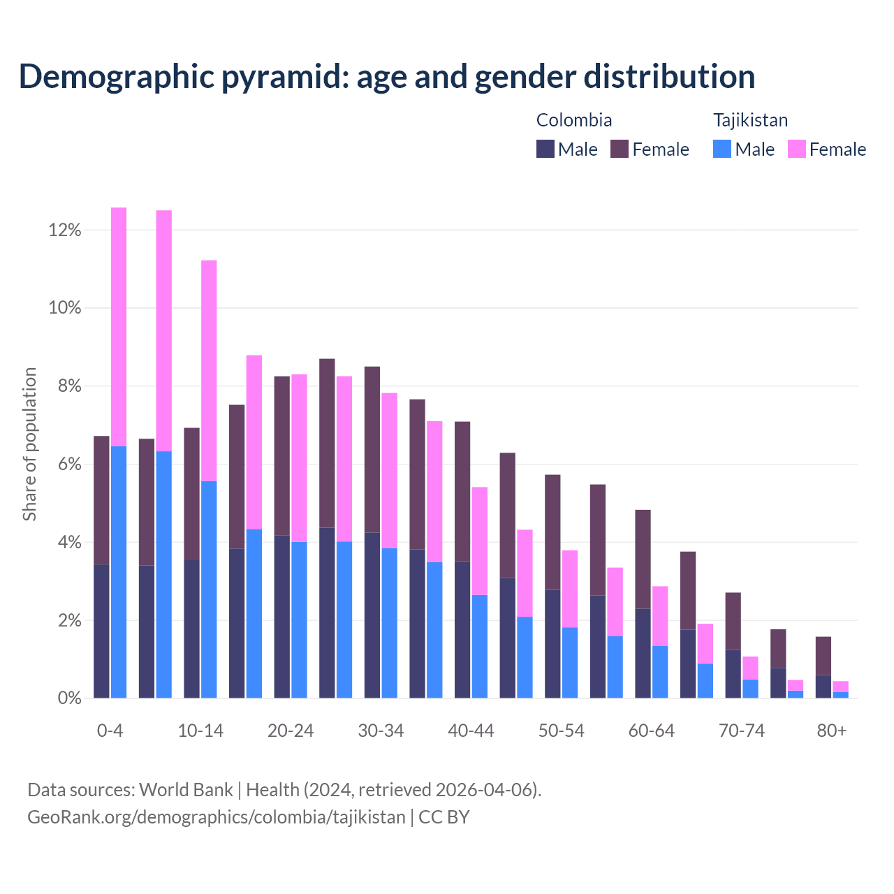 The share of older people aged 65 and over is 9.78% in Colombia and 3.85% in Tajikistan. Life expectancy in Colombia compared to Tajikistan .